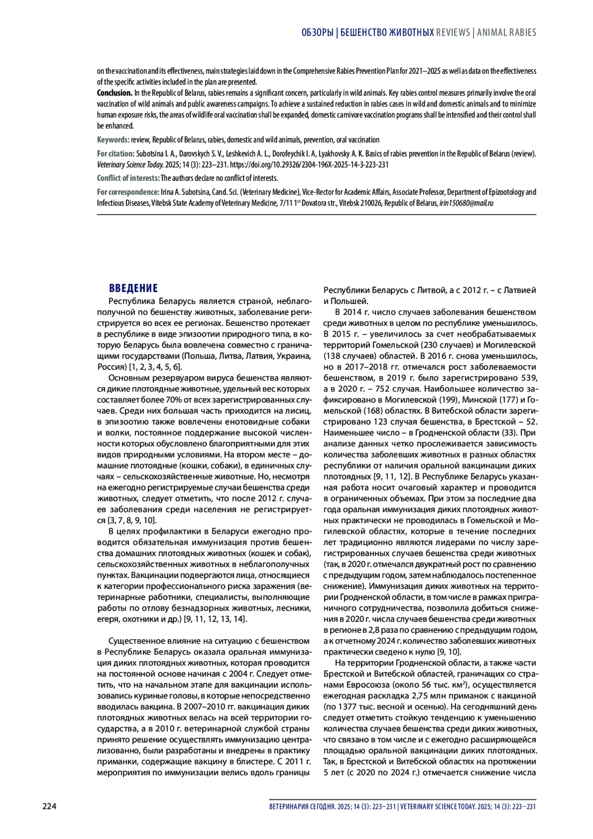 Результаты. Приведены актуальные данные об эпизоотической и эпидемиологической ситуации по бешенству в Республике Беларусь. Бешенство на территории республики протекает в виде эпизоотии природного типа, в которую она была вовлечена совместно с граничащими государствами (Польша, Литва, Латвия, Украина, Россия). Чаще всего резервуаром вируса бешенства являются дикие плотоядные животные (70% от всех зарегистрированных случаев): лисицы, енотовидные собаки и волки. На втором месте – домашние плотоядные (кошки, собаки), в единичных случаях – сельскохозяйственные животные. В статье описаны основные направления работы ветеринарной и санитарно-эпидемиологической службы Республики Беларусь, включая специфическую профилактику бешенства среди домашних плотоядных животных, оральную антирабическую вакцинацию диких плотоядных животных и информационную работу с населением, приводятся исторические и современные данные о вакцинации и ее эффективности, представлены основные стратегические направления Комплексного плана профилактики бешенства на 2021–2025 гг., приведены данные об эффективности отдельных мероприятий плана.