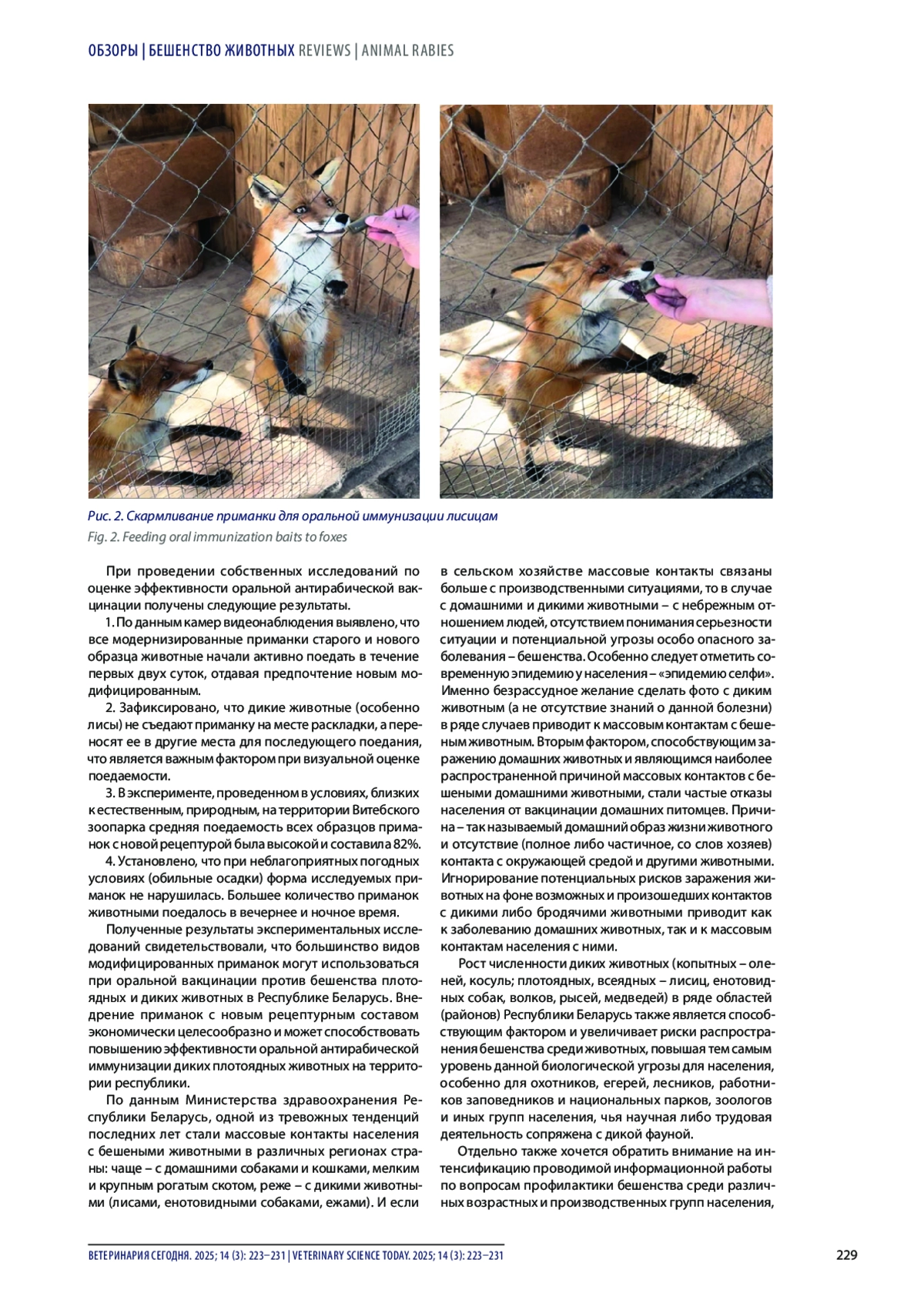 Введение. На территории Российской Федерации регистрируются эпизоотии бешенства природного типа, которые характеризуются стабильно высокой инцидентностью среди диких и домашних животных. Непрерывность эпизоотического процесса бешенства обеспечивается биологической резервацией вируса Lyssavirus rabies в популяциях диких хищников семейства псовых, преимущественно в популяции рыжей лисицы (Vulpes vulpes). Экология и этология лисиц предопределяют территорию распространения бешенства, сезонную динамику инцидентности и видовой состав животных, вовлекаемых в эпизоотический процесс.