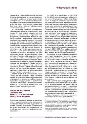 3. Кемалова Л. И. Особенности воспитания студенческой молодежи в условиях глобальных вызовов // Вестник педагогических наук. 2023. № 8. С. 76-81. EDN: VEGQPF