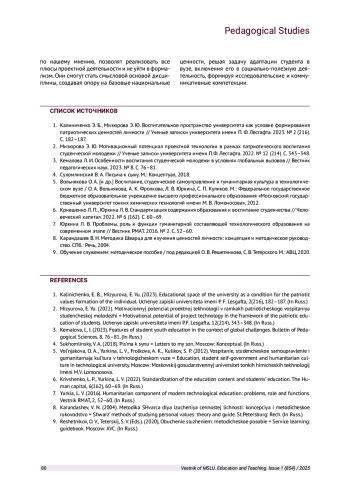 1. Калиниченко Э. Б., Мизюрова Э. Ю. Воспитательное пространство университета как условие формирования патриотических ценностей личности // Ученые записки университета имени П. Ф. Лесгафта. 2023. № 2 (216). С. 182-187. EDN: OBZWUG