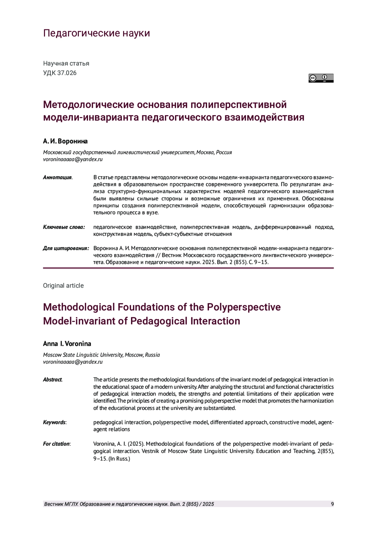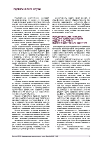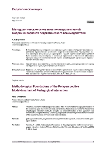 В статье представлены методологические основы модели-инварианта педагогического взаимодействия в образовательном пространстве современного университета. По результатам анализа структурно-функциональных характеристик моделей педагогического взаимодействия были выявлены сильные стороны и возможные ограничения их применения. Обоснованы принципы создания полиперспективной модели, способствующей гармонизации образовательного процесса в вузе.