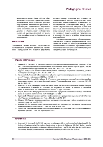5. Semenova L. A. [et al.] Pedagogical Interaction in High School, the Structural and Functional Model of Pedagogical Interaction / L. A. Semenova, A. I. Kazantseva, V. V. Sergeyeva, Y. M. Raklova, Z. B. Baiseitova // International Journal of Environmental and Science Education. 2016. Vol. 11 (9). P. 2553-2566. EDN: WVBQTP