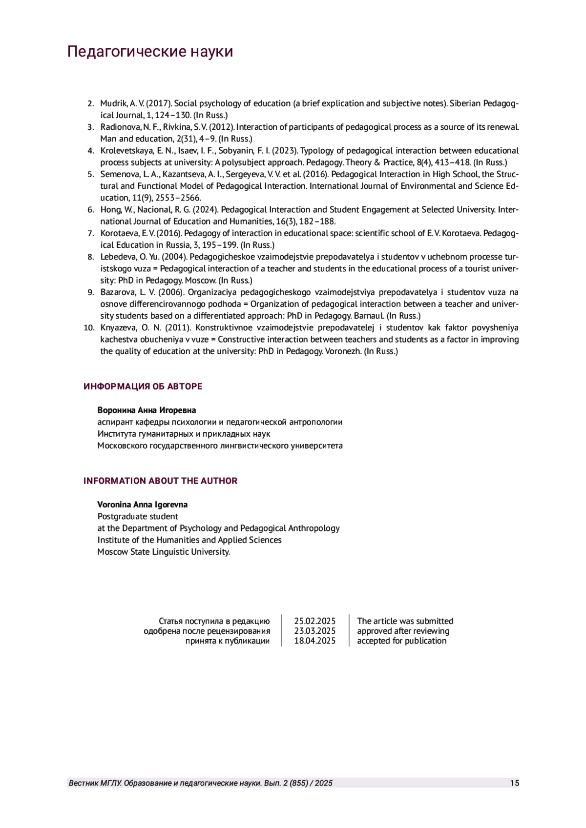 4. Кролевецкая Е. Н., Исаев И. Ф., Собянин Ф. И. Типология педагогического взаимодействия субъектов образовательного процесса в вузе: полисубъектный подход // Педагогика. Вопросы теории и практики. 2023. Т. 8. Вып. 4. С. 413-418. EDN: YROOTX