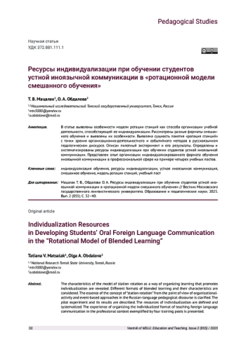 В статье выявлены особенности модели ротации станций как способа организации учебной деятельности, способствующей ее индивидуализации. Рассмотрены разные форматы смешанного обучения и выявлены их особенности. Выявлена сущность понятия «ротация станций» с точки зрения организационно деятельностного и событийного методов в русскоязычном педагогическом дискурсе. Описан пилотный эксперимент и его результаты. Определены и систематизированы ресурсы индивидуализации при обучении студентов устной иноязычной коммуникации. Представлен опыт организации индивидуализированного формата обучения иноязычной коммуникации в профессиональной сфере на примере четырех учебных постов.