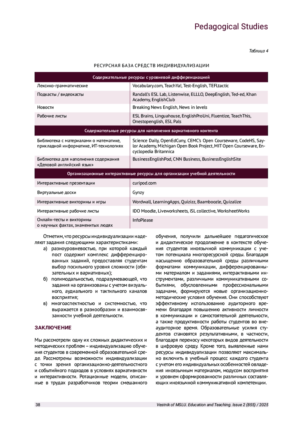 В статье представлены результаты экспериментального исследования по созданию иноязычной профессионально ориентированной смешанной многоресурсной образовательной среды. Предложены дидактические принципы, учитывающие интеграцию физического и цифрового пространств и их ресурсов при обучении иностранному языку. Анкетирование подтвердило эффективность данного подхода для развития иноязычной коммуникативной компетенции студентов, а также их критического мышления, цифровых компетенций и навыков научной коммуникации.