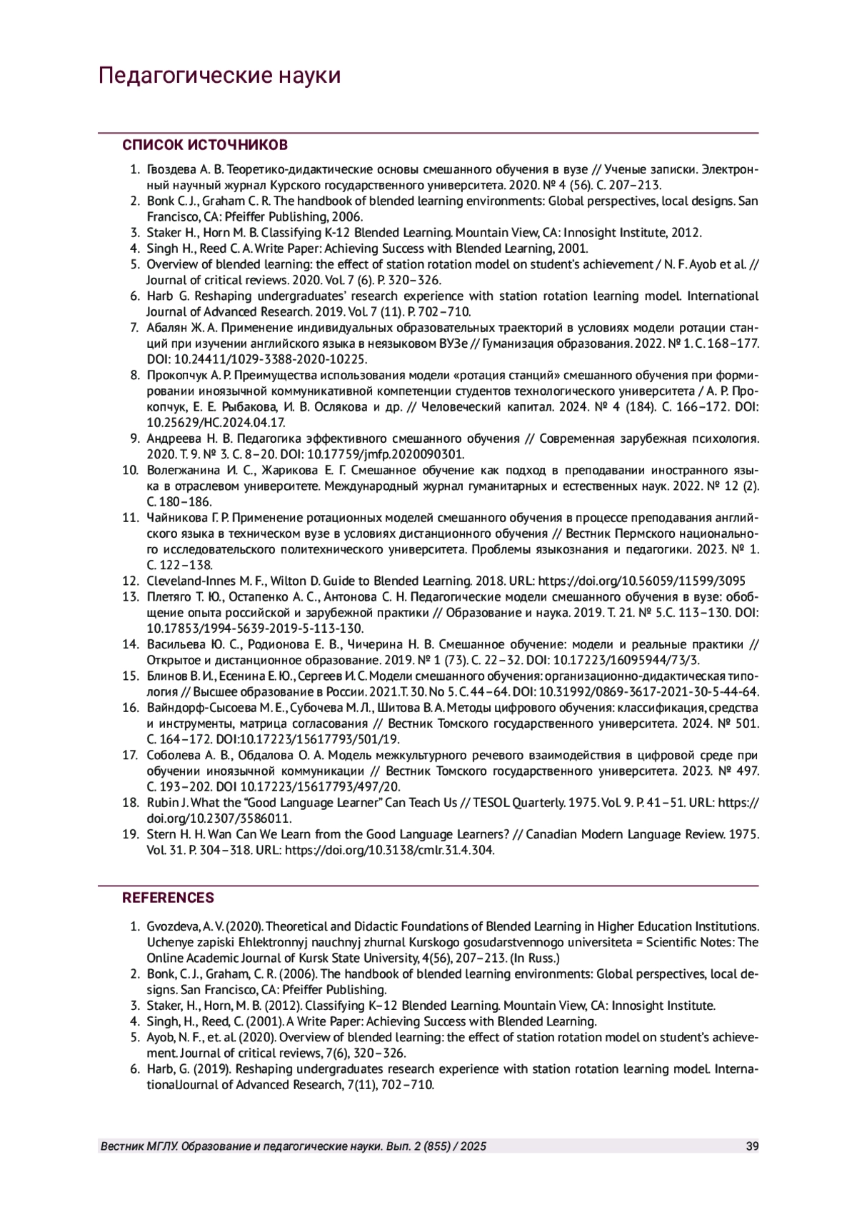 14. Васильева Ю. С., Родионова Е. В., Чичерина Н. В. Смешанное обучение: модели и реальные практики // Открытое и дистанционное образование. 2019. № 1 (73). С. 22-32. DOI: 10.17223/16095944/73/3 EDN: FZLORT