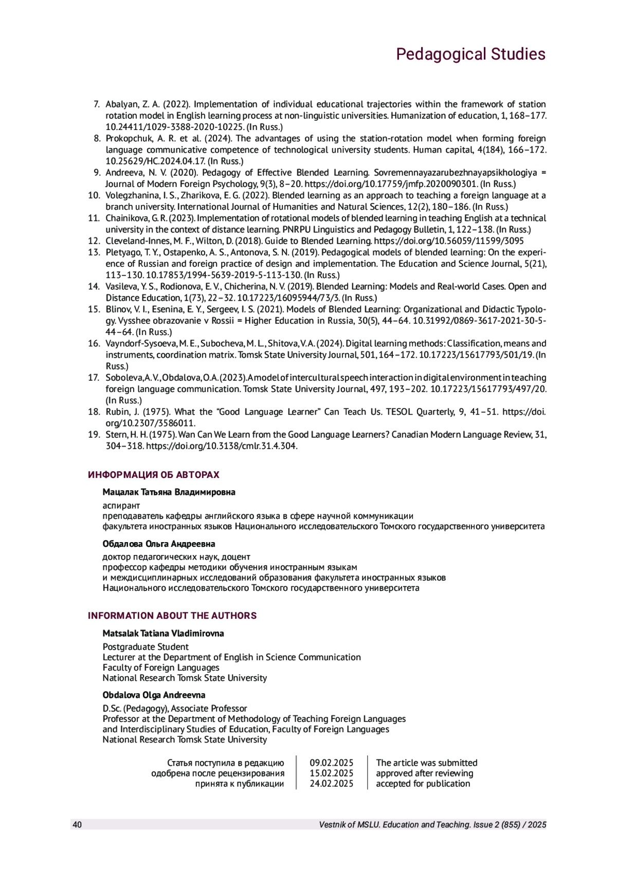 11. Чайникова Г. Р. Применение ротационных моделей смешанного обучения в процессе преподавания английского языка в техническом вузе в условиях дистанционного обучения // Вестник Пермского национального исследовательского политехнического университета. Проблемы языкознания и педагогики. 2023. № 1. С. 122-138.