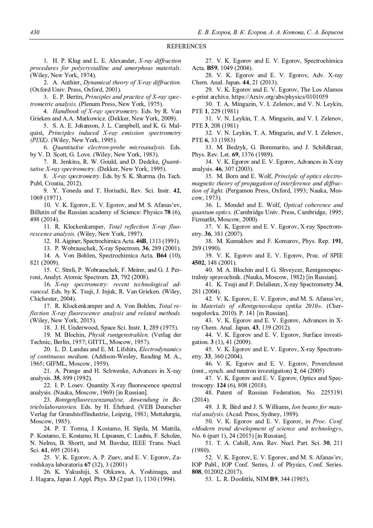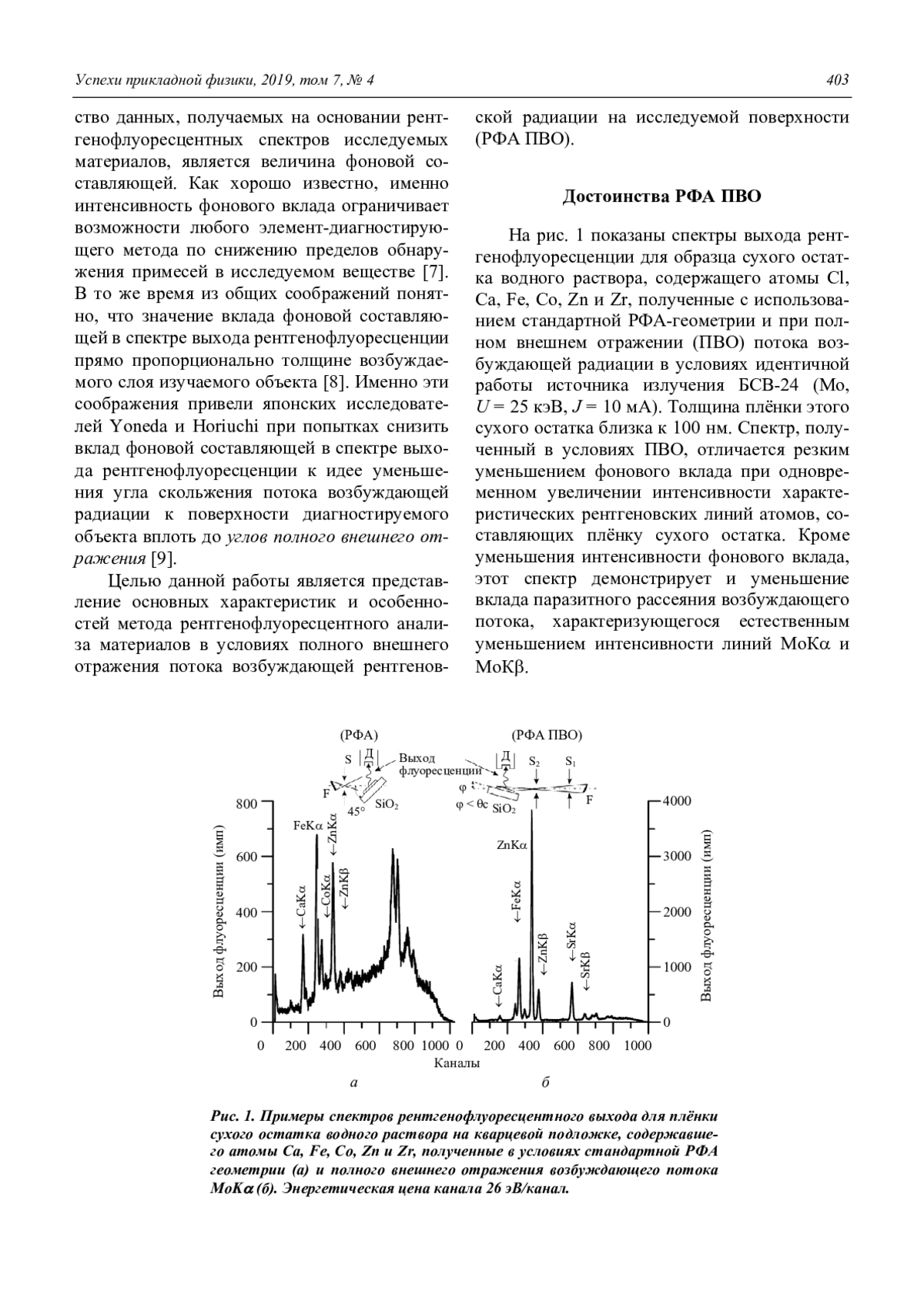ЕГОРОВ Е. В., ЕГОРОВ В. К., КОТОВА А. А., БОРИСОВ С. А. ВЫСОКОЭФФЕКТИВНАЯ РЕНТГЕНОФЛУОРЕСЦЕНТНАЯ СПЕКТРОМЕТРИЯ МАТЕРИАЛОВ В УСЛОВИЯХ ПОЛНОГО ВНЕШНЕГО ОТРАЖЕНИЯ ПОТОКОВ ВОЗБУЖДЕНИЯ, СФОРМИРОВАННЫХ ВОЛНОВОДНО-РЕЗОНАНСНЫМИ УСТРОЙСТВАМИ // УСПЕХИ ПРИКЛАДНОЙ ФИЗИКИ. 2019. ТОМ 7, № 4