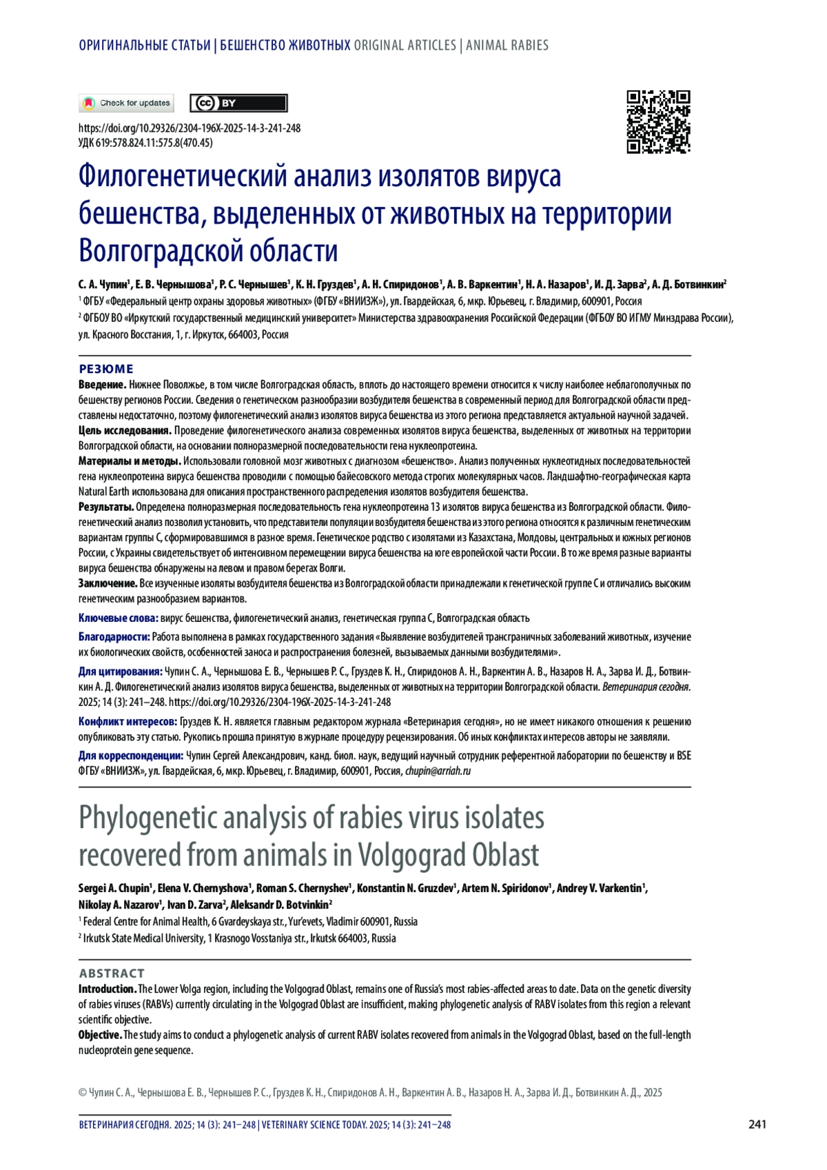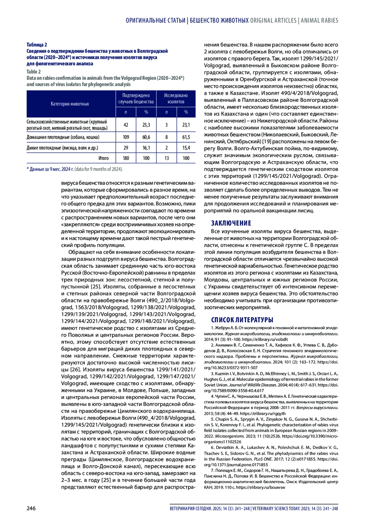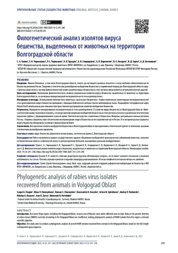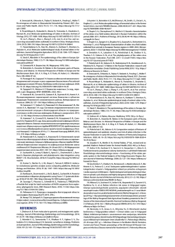 5. Chupin S. A., Sprygin A. V., Zinyakov N. G., Guseva N. A., Shcherbinin S. V., Korennoy F. I., et al. Phylogenetic characterization of rabies virus field isolates collected from animals in European Russian regions in 20092022. Microorganisms. 2023; 11 (10):2526. DOI: 10.3390/micro-organisms11102526