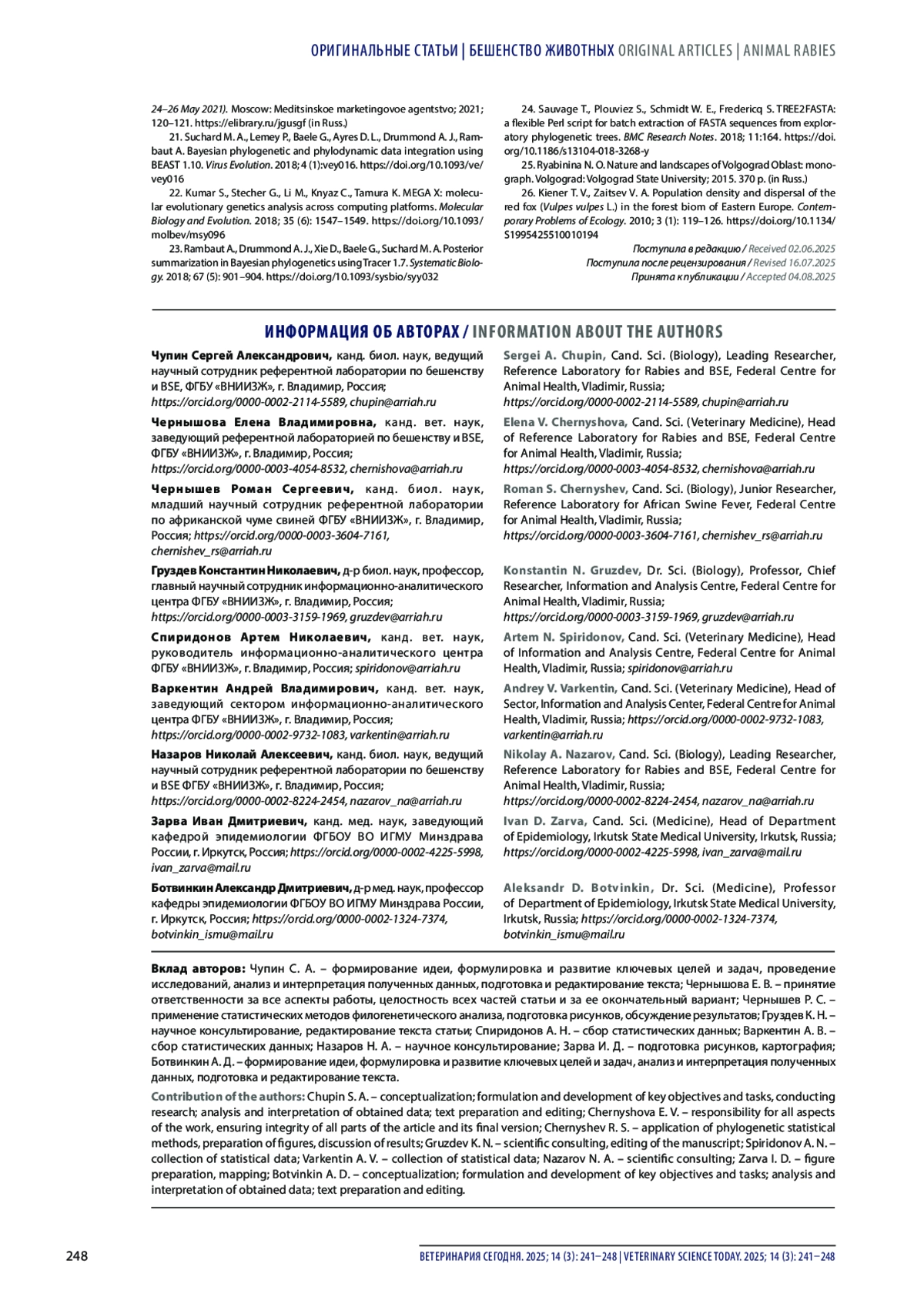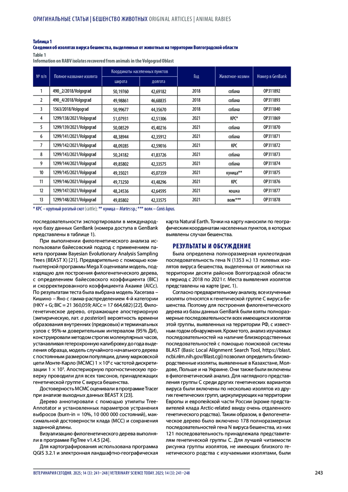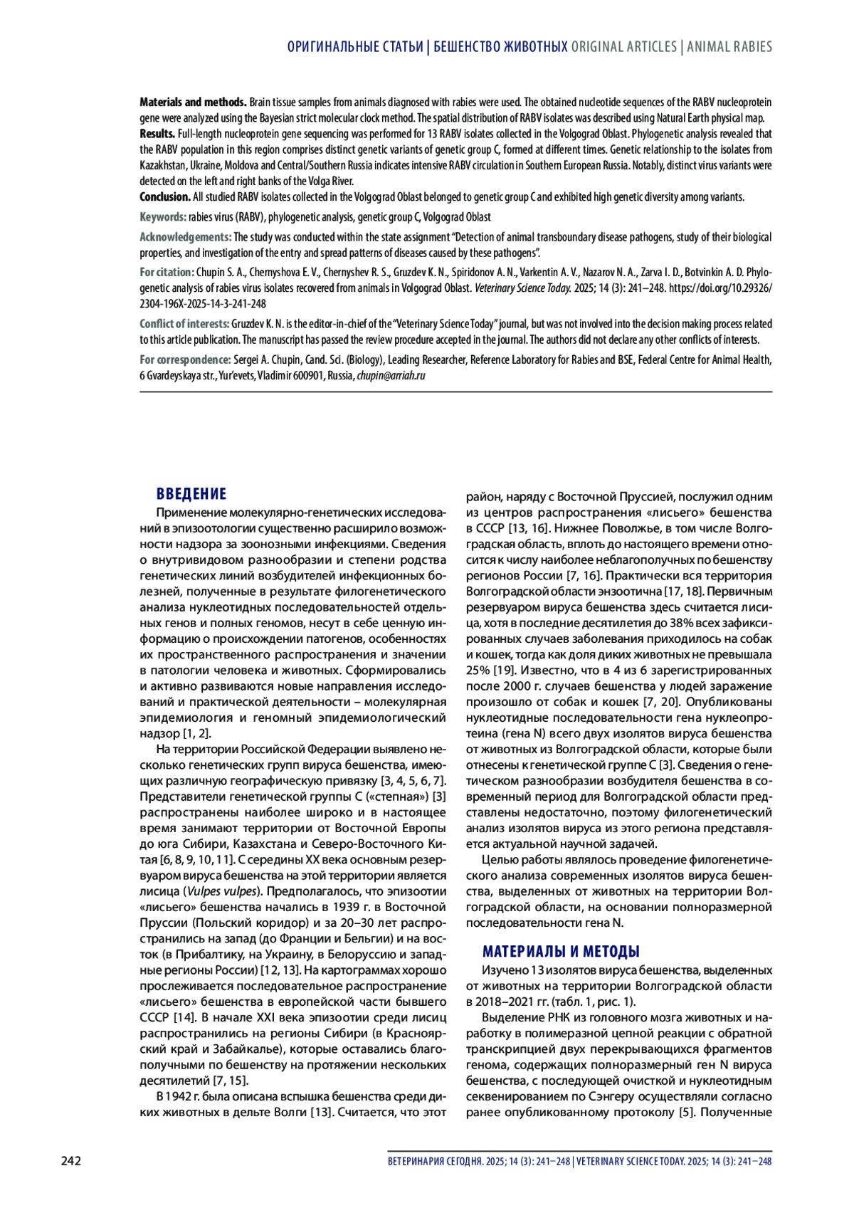 5. Chupin S. A., Sprygin A. V., Zinyakov N. G., Guseva N. A., Shcherbinin S. V., Korennoy F. I., et al. Phylogenetic characterization of rabies virus field isolates collected from animals in European Russian regions in 20092022. Microorganisms. 2023; 11 (10):2526. DOI: 10.3390/micro-organisms11102526