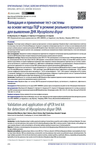 Введение. В настоящее время наблюдается широкое распространение и активная циркуляция Mycoplasma dispar в животноводческих хозяйствах по всему миру, в том числе и в Российской Федерации. Актуальность внедрения в ветеринарную практику тест-системы на основе полимеразной цепной реакции в режиме реального времени для выявления ДНК Mycoplasma dispar обусловлена важной ролью данного возбудителя в развитии комплекса респираторных болезней крупного рогатого скота, приводящих к значительным экономическим потерям в животноводстве, в том числе являющихся причиной падежа телят.
