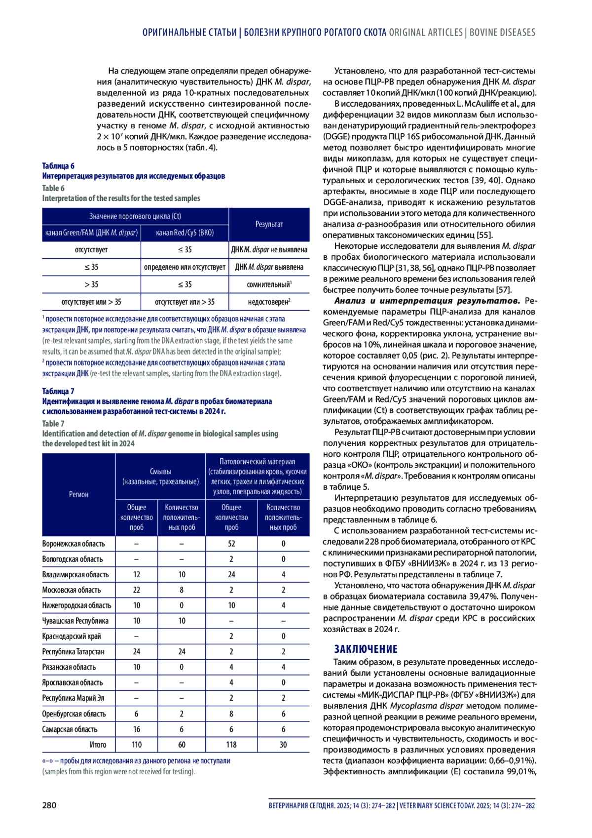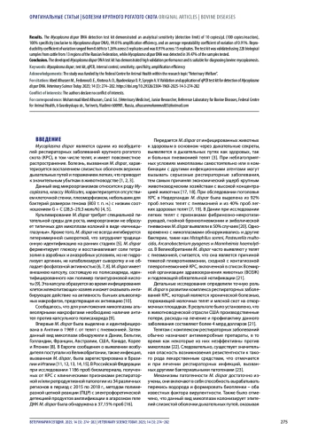 Заключение. Разработанная тест-система для выявления ДНК Mycoplasma dispar продемонстрировала высокие валидационные показатели и может быть использована в диагностике микоплазмоза крупного рогатого скота.