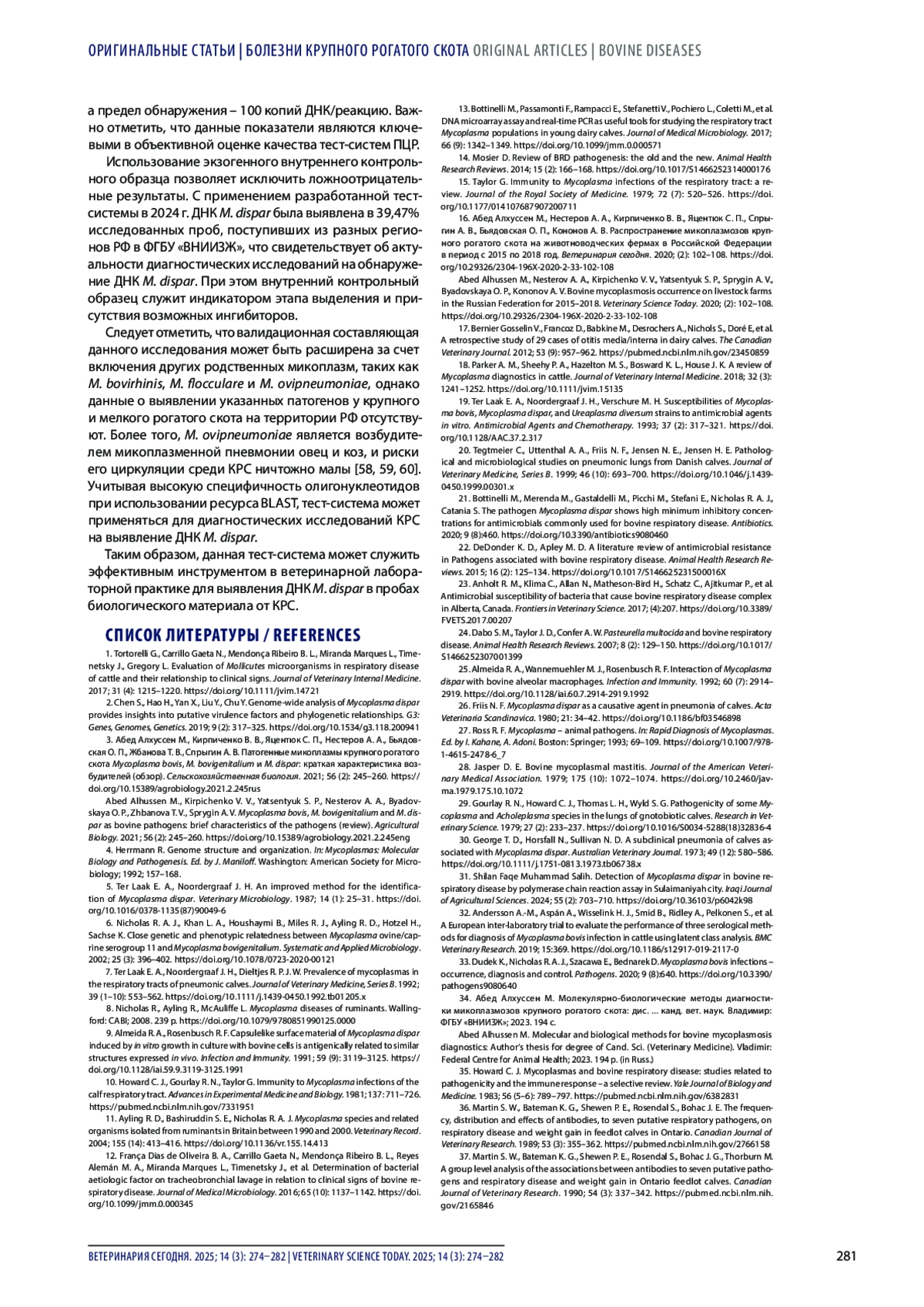 3. Абед Алхуссен М., Кирпиченко В. В., Яцентюк С. П., Нестеров А. А., Бьядовская О. П., Жбанова Т. В., Спрыгин А. В. Патогенные микоплазмы крупного рогатого скота Mycoplasma bovis, M. bovigenitalium и M. dispar, краткая характеристика возбудителей (обзор). Сельскохозяйственная биология. 2021; 56 (2): 245-260. DOI: 10.15389/agrobiology.2021.2.245rus