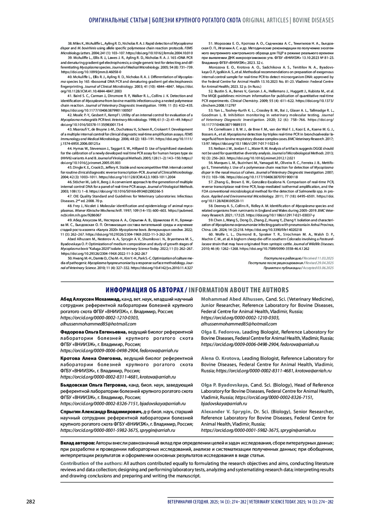 34. Абед Алхуссен М. Молекулярно-биологические методы диагностики микоплазмозов крупного рогатого скота: дис.. канд. вет. наук. Владимир: ФГБУ “ВНИИЗЖ”; 2023. 194 с. Abed Alhussen M. Molecular and biological methods for bovine mycoplasmosis diagnostics: Author’s thesis for degree of Cand. Sci. (Veterinary Medicine). Vladimir: Federal Centre for Animal Health; 2023. 194 p. (in Russ.).
