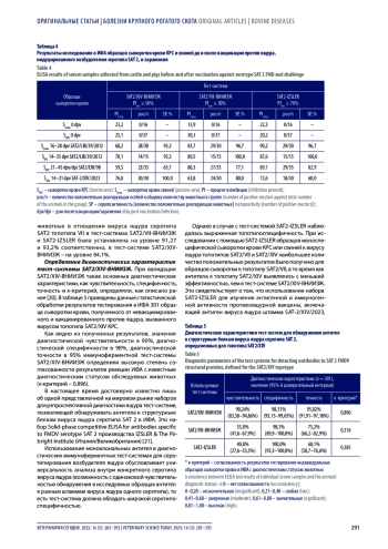 Результаты. Эффективность предложенной тест-системы в регистрации выработки антител к вирусу ящура топотипа SAT2/XIV была выше, чем у других иммуноферментных тест-систем, обладающих выраженной топотипоспецифичностью к возбудителю ящура топотипа SAT2/VII. У отдельных особей крупного рогатого скота специфические антитела выявляли на 7-е сут после вакцинации. Высокие значения диагностической чувствительности (90%), диагностической специфичности (98%) и диагностической точности (95%) определили высокую степень согласованности результатов реакции иммуноферментного анализа с известным диагностическим статусом обследуемых животных (κ-критерий – 0,896).