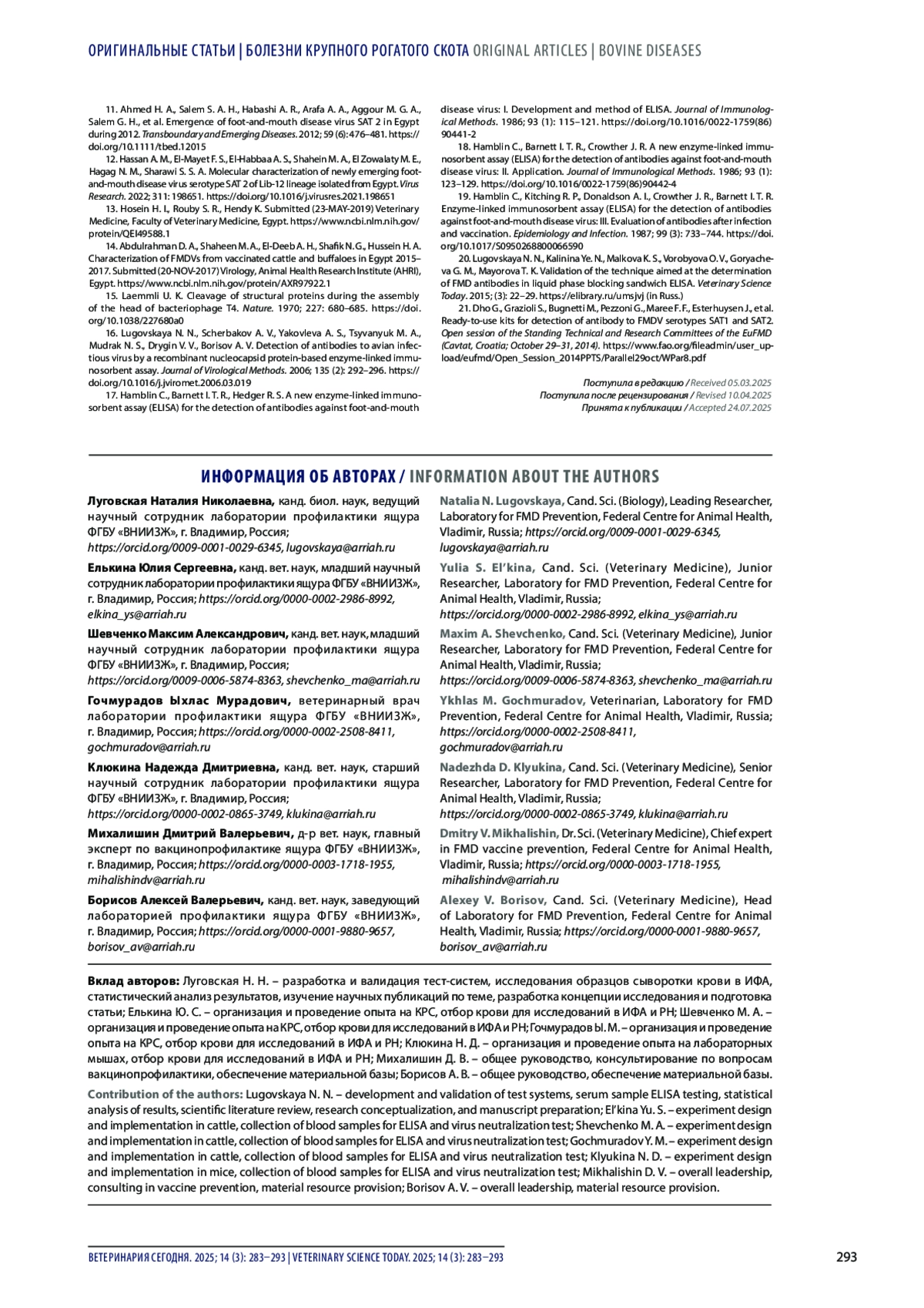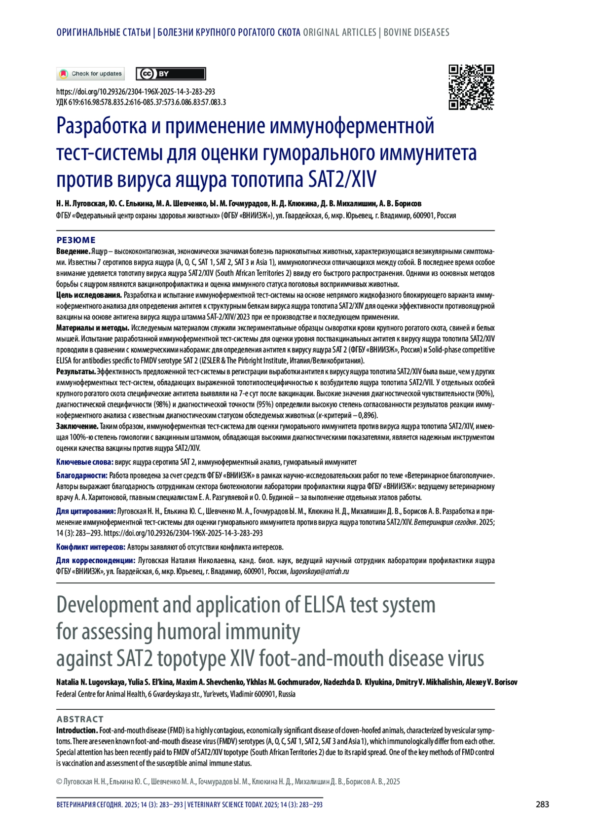 Статья: Разработка и применение иммуноферментной тест-системы для оценки гуморального иммунитета против вируса ящура топотипа SAT2/XIV (2025)