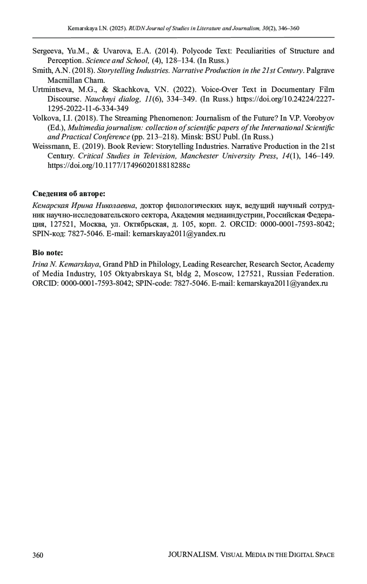 26. Weissmann E. Book Review: Storytelling Industries. Narrative Production in the 21st Century // Critical Studies in Television, Manchester University Press. 2019. Vol. 14. No. 1. P. 146-149. DOI: 10.1177/1749602018818288c