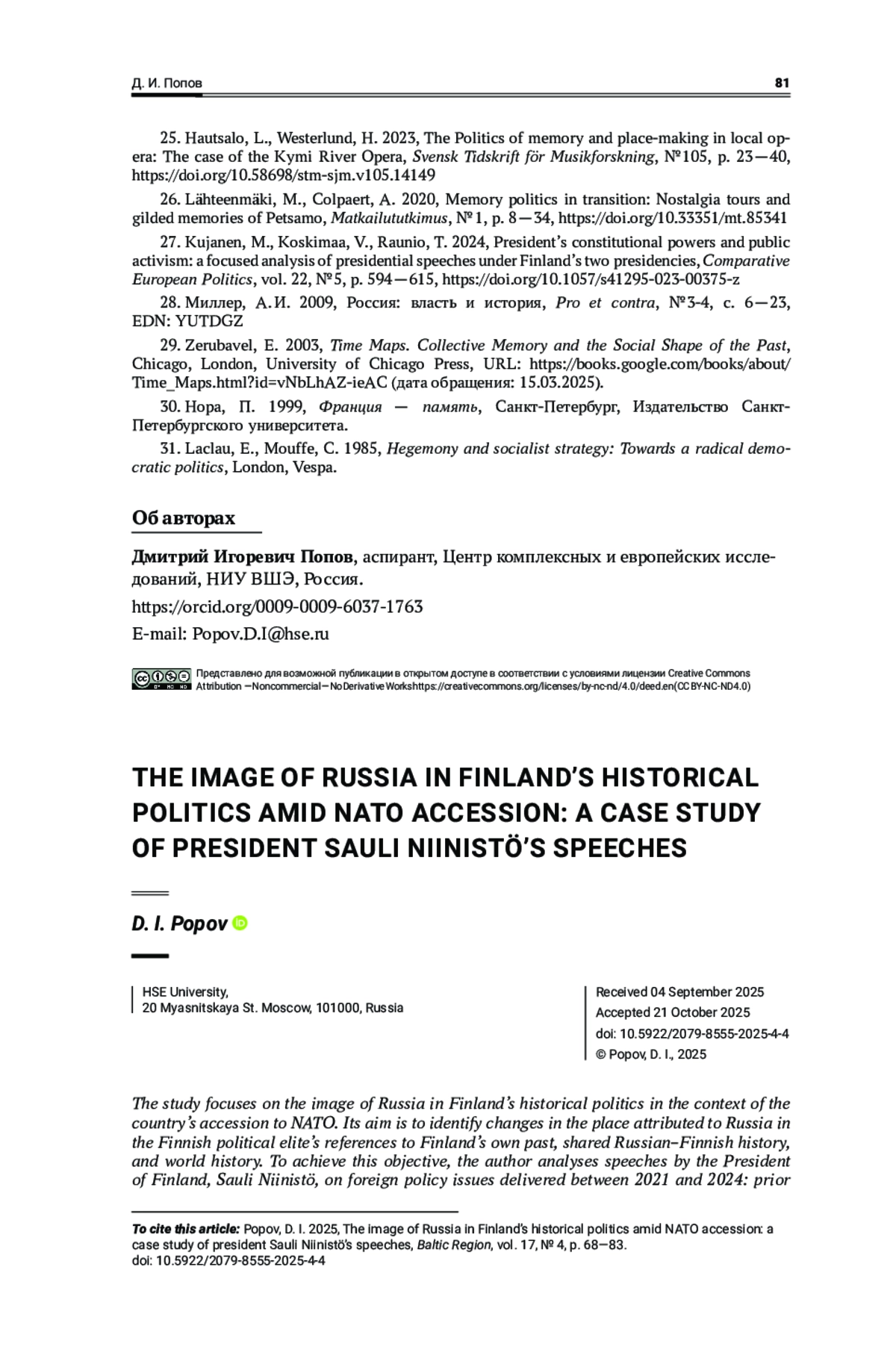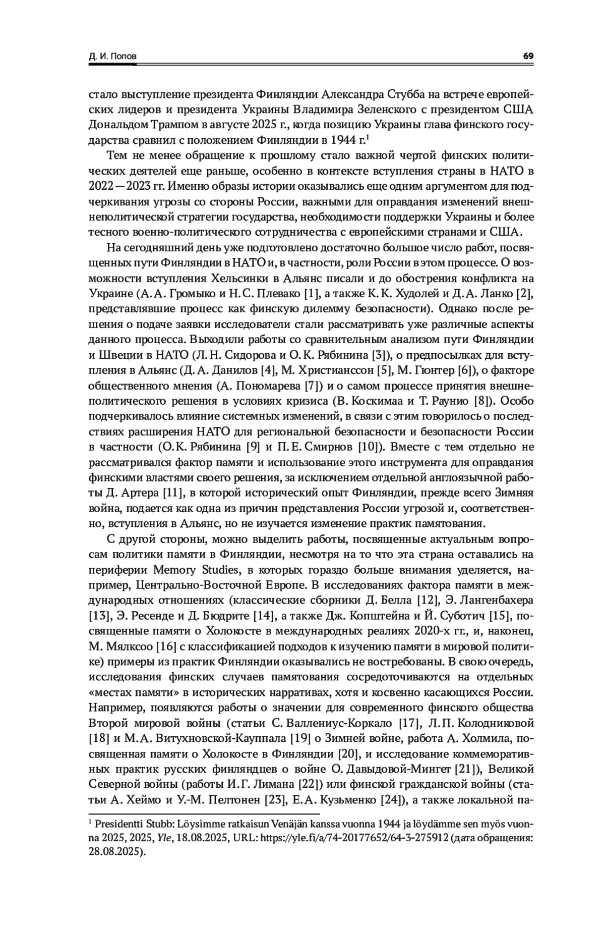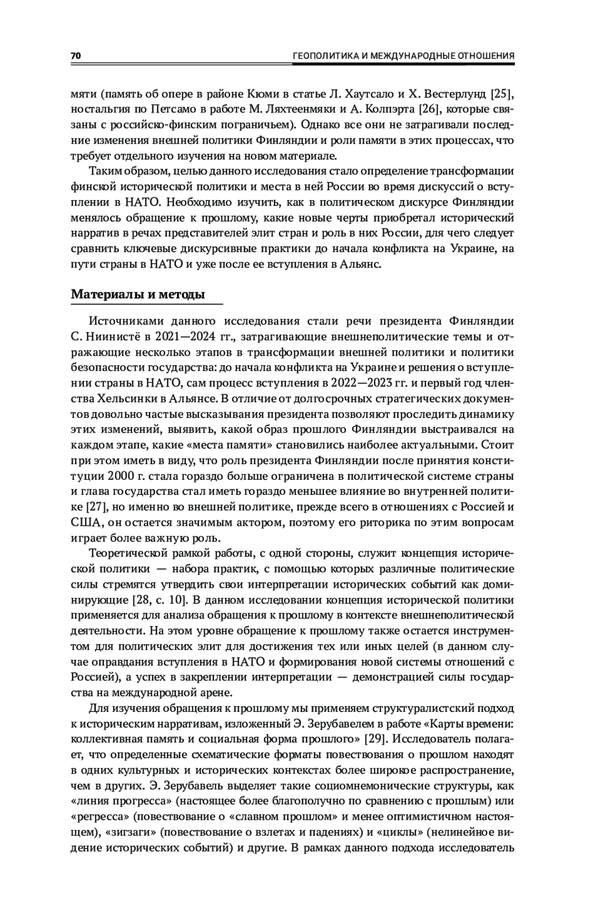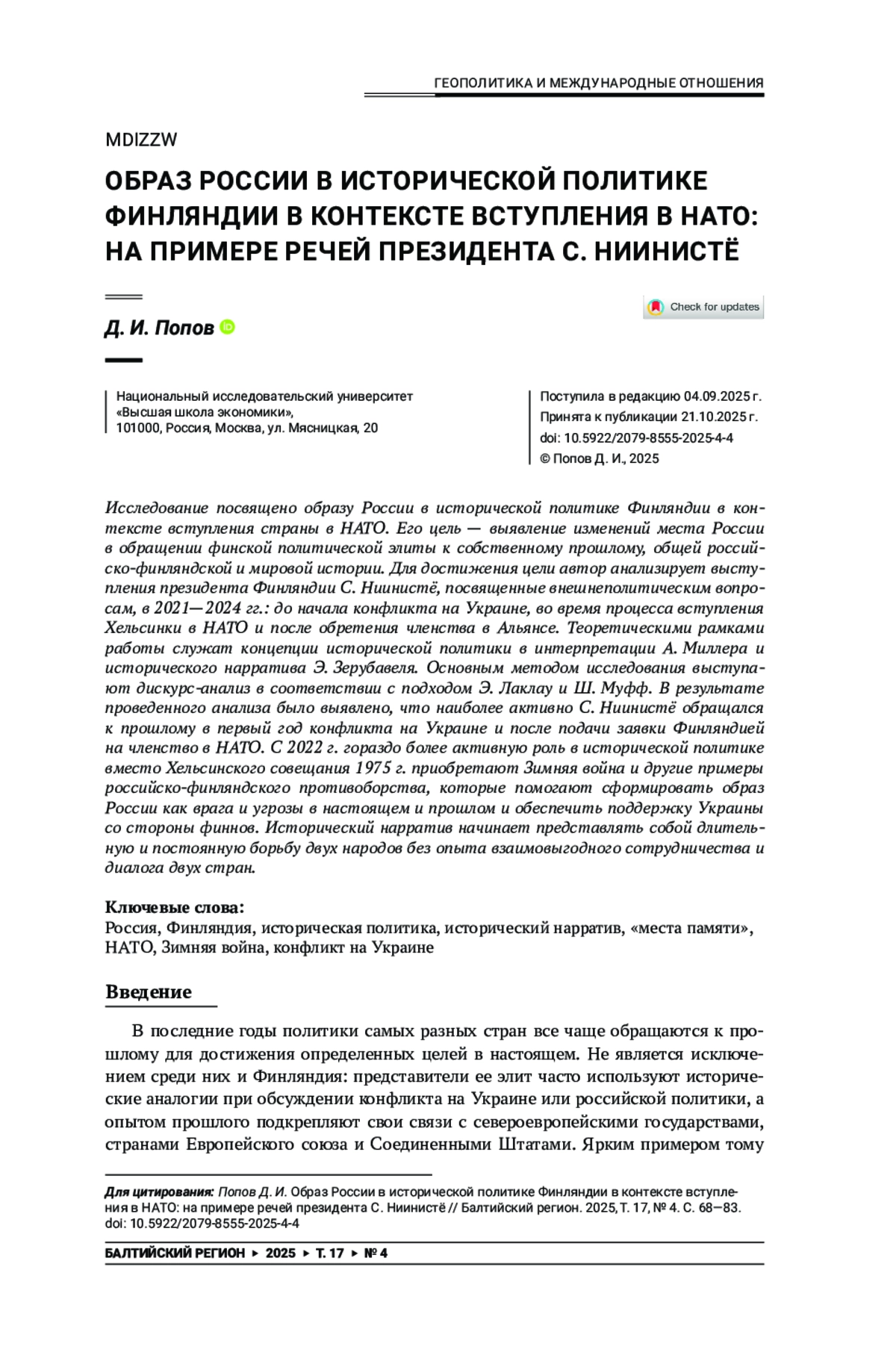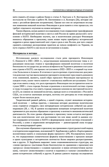 Исследование посвящено образу России в исторической политике Финляндии в контексте вступления страны в НАТО. Его цель — выявление изменений места России в обращении финской политической элиты к собственному прошлому, общей российско-финляндской и мировой истории. Для достижения цели автор анализирует выступления президента Финляндии С. Ниинистё, посвященные внешнеполитическим вопросам, в 2021—2024 гг.: до начала конфликта на Украине, во время процесса вступления Хельсинки в НАТО и после обретения членства в Альянсе. Теоретическими рамками работы служат концепции исторической политики в интерпретации А. Миллера и исторического нарратива Э. Зерубавеля. Основным методом исследования выступают дискурс-анализ в соответствии с подходом Э. Лаклау и Ш. Муфф. В результате проведенного анализа было выявлено, что наиболее активно С. Ниинистё обращался к прошлому в первый год конфликта на Украине и после подачи заявки Финляндией на членство в НАТО. С 2022 г. гораздо более активную роль в исторической политике вместо Хельсинского совещания 1975 г. приобретают Зимняя война и другие примеры российско-финляндского противоборства, которые помогают сформировать образ России как врага и угрозы в настоящем и прошлом и обеспечить поддержку Украины со стороны финнов. Исторический нарратив начинает представлять собой длительную и постоянную борьбу двух народов без опыта взаимовыгодного сотрудничества и диалога двух стран.