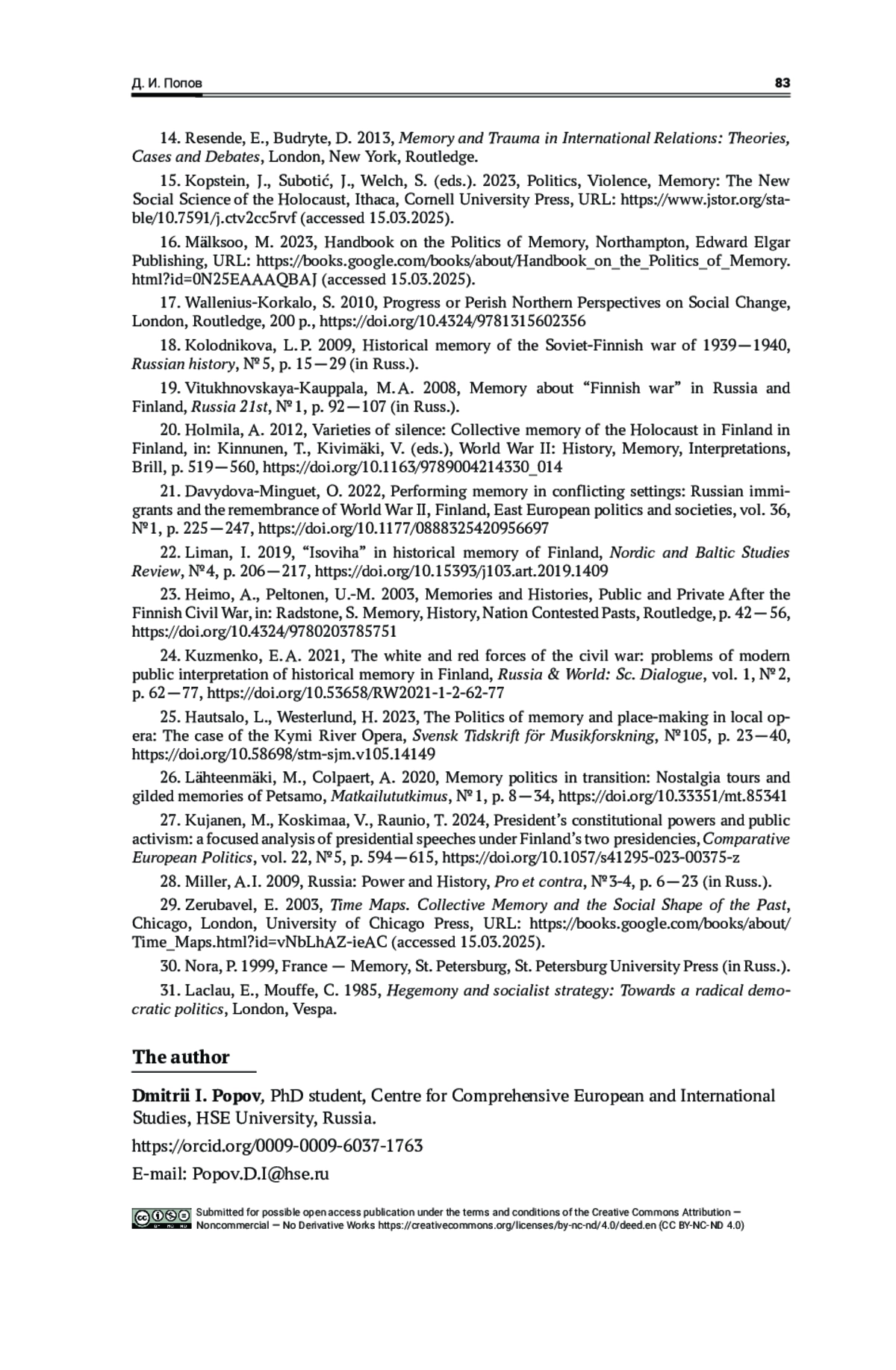 Davydova-Minguet, O. 2022, Performing memory in conflicting settings: Russian immigrants and the remembrance of World War II, Finland, East European politics and societies, vol. 36, № 1, p. 225—247, https://doi.org/10.1177/0888325420956697