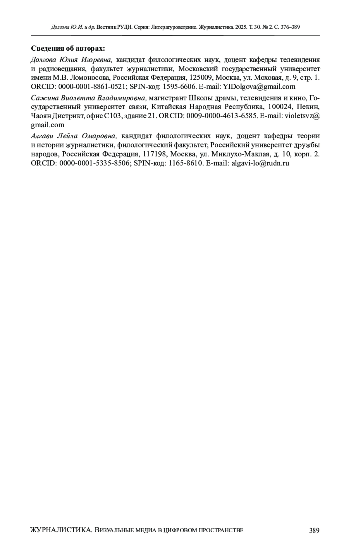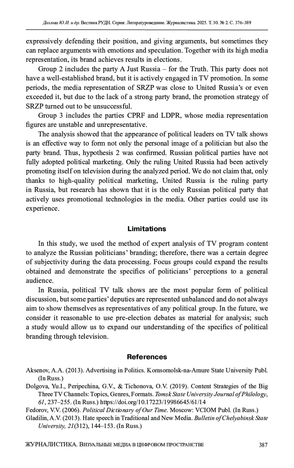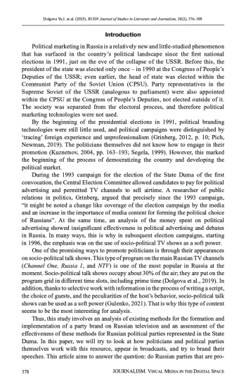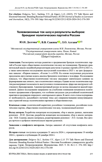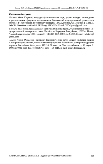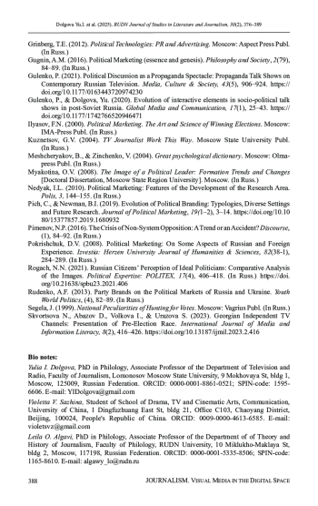 8. Gulenko, P., & Dolgova, Yu. (2020). Evolution of interactive elements in socio-political talk shows in post-Soviet Russia. Global Media and Communication, 17(1), 25-43. DOI: 10.1177/1742766520946471 EDN: HRSUNQ