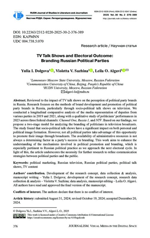 Reviewed to the impact of TV talk shows on the perception of political party brands in Russia. Research focuses on the methods of brand development and promotion of political party brands in Russia, particularly through socio-political talk shows on television. We conducted a longitudinal comparative analysis of the media representation of deputies from various parties in 2019 and 2021, along with a qualitative study of politicians’ performances in 2023 across three federal channels: Channel One, Russia 1, and NTV. Based on our findings, we propose a two-stage model for analyzing the branding of politicians in television broadcasts. The study found that socio-political talk shows have a significant impact on both personal and political image formation. However, not all political parties take advantage of this opportunity to promote their image through broadcasts. The availability of administrative resources is not always a determining factor in a party’s success in branding. This work aims to enhance the understanding of the mechanisms involved in political promotion and branding, which is especially pertinent to Russian political practice as we approach the next electoral cycle. In light of this, the article underscores the necessity for further research to refine communication strategies between political parties and the public.