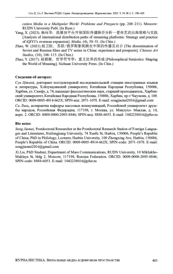 14. Ян С. 杨向华. 流媒体平台开展国际传播路径分析-爱奇艺的出海策略与实践 [Анализ международных путей распространения потоковых платформ - стратегия и практика выхода iQIYI на зарубежные рынки] // Медиа. 2023. № 4. C. 50-51.