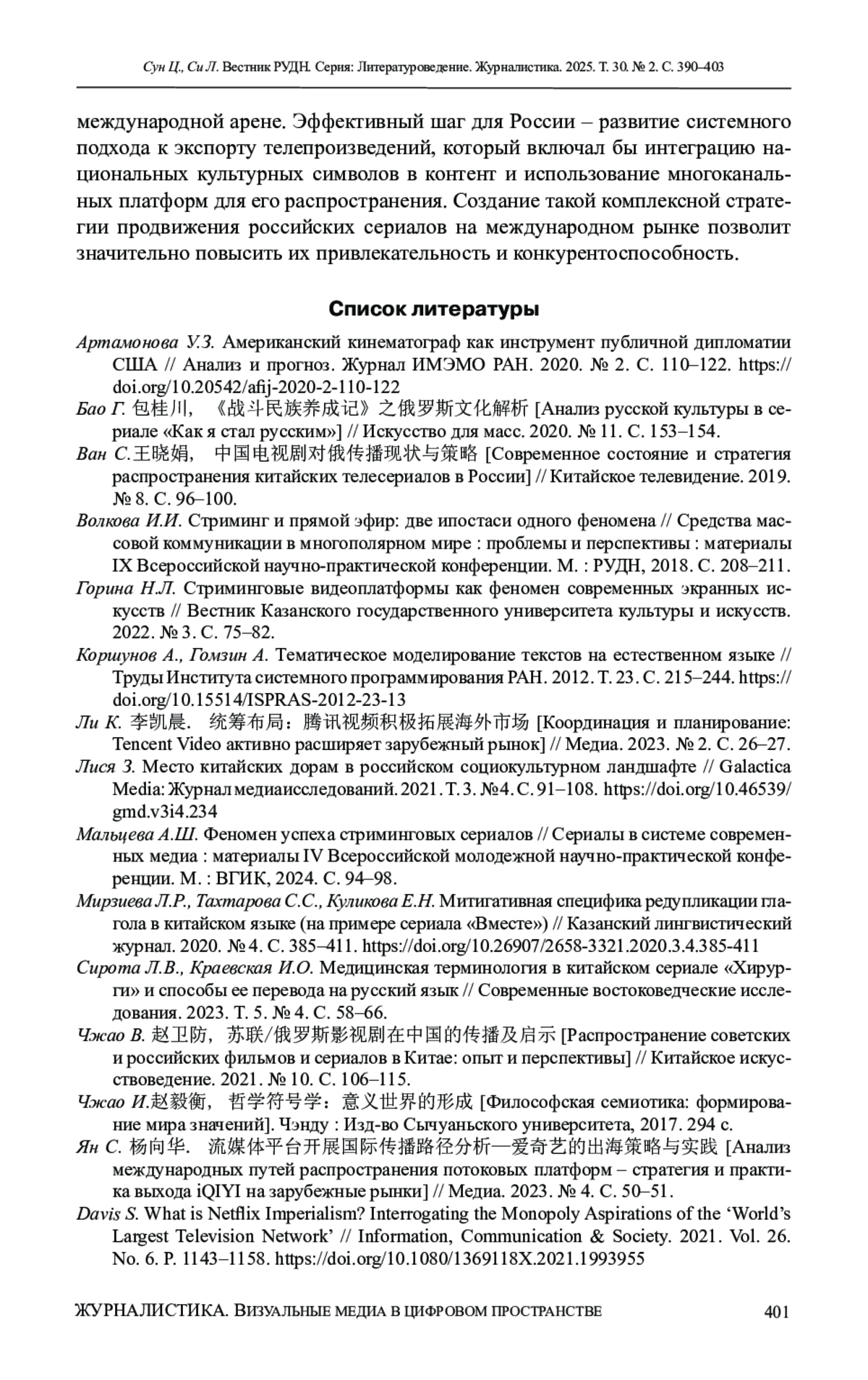 3. Ван С.王晓娟, 中国电视剧对俄传播现状与策略 [Современное состояние и стратегия распространения китайских телесериалов в России] // Китайское телевидение. 2019. № 8. С. 96-100.