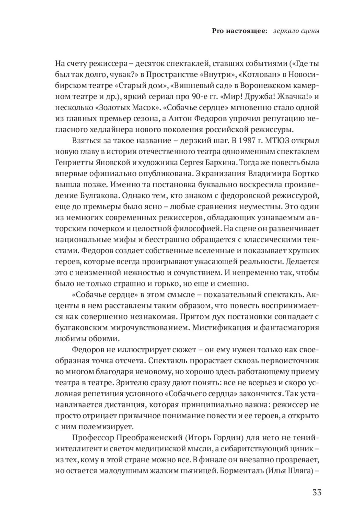 На счету режиссера – десяток спектаклей, ставших событиями («Где ты был так долго, чувак?» в Пространстве «Внутри», «Котлован» в Новосибирском театре «Старый дом», «Вишневый сад» в Воронежском камерном театре и др.), яркий сериал про 90-е гг. «Мир! Дружба! Жвачка!» и несколько «Золотых Масок». «Собачье сердце» мгновенно стало одной из главных премьер сезона, а Антон Федоров упрочил репутацию негласного хедлайнера нового поколения российской режиссуры.