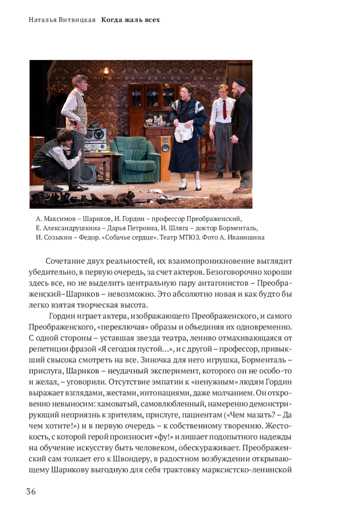 В апреле на сцене МТЮЗа состоялась премьера «Собачьего сердца» Антона Федорова по булгаковской повести. В спектакле нет дидактики и морализаторства, нет сатиры на большевизм или либералов. Вместо этого – неподдельная горечь, абсурдистская постирония и искреннее сострадание ко всем «человекам».