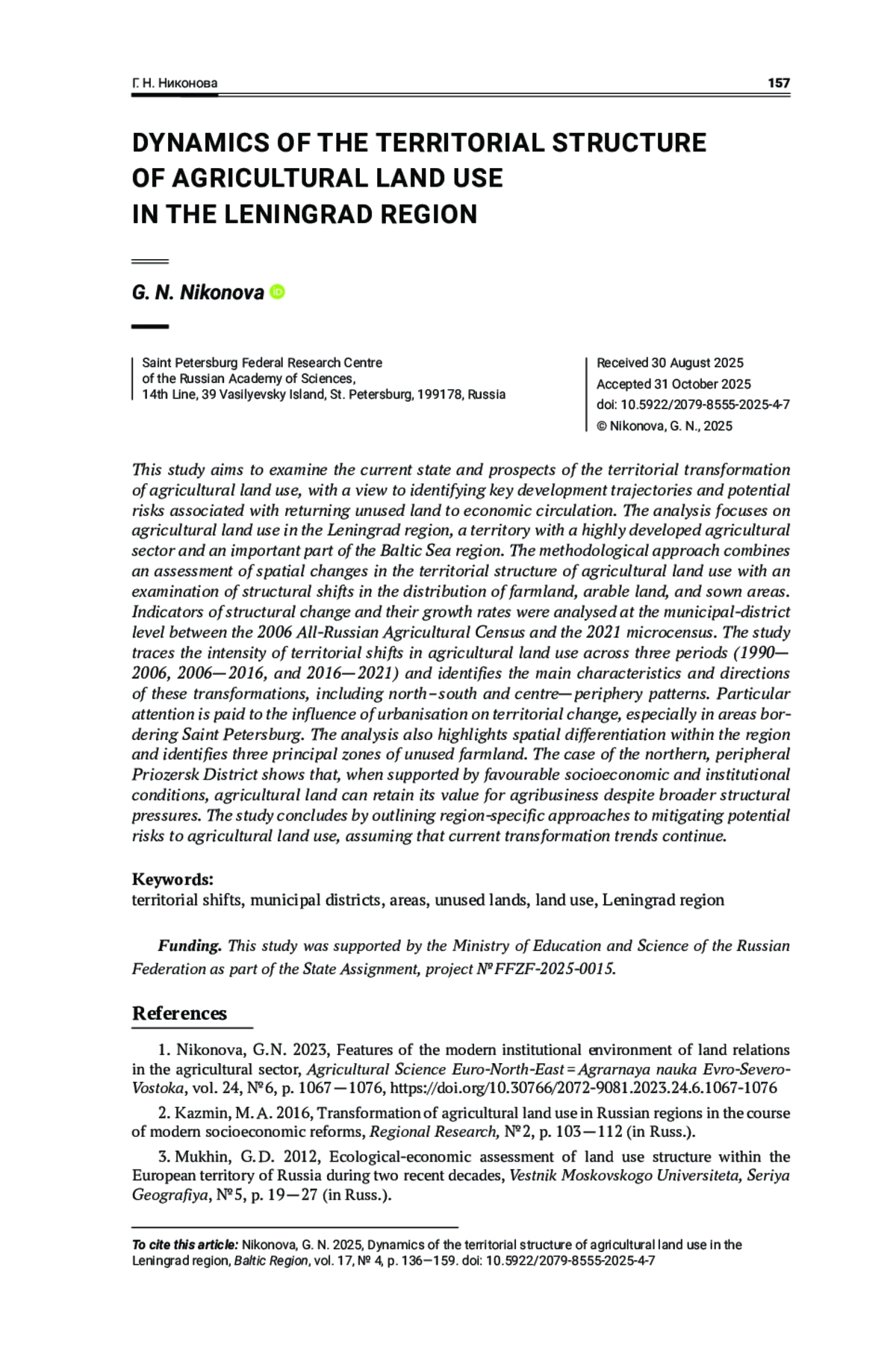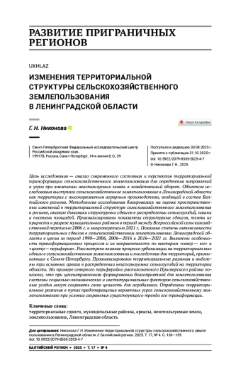 Цель исследования — анализ современного состояния и перспектив территориальной трансформации сельскохозяйственного землепользования для определения направлений и угроз при вовлечении неиспользуемых земель в хозяйственный оборот. Объектом исследования выступало сельскохозяйственное землепользование в Ленинградской области как территории с высокоразвитым аграрным производством, входящей в состав Балтийского региона. Методология исследования базировалась на оценке пространственных изменений в территориальной структуре сельскохозяйственного землепользования в регионе, анализе динамики структурных сдвигов в распределении сельхозугодий, пашни и посевных площадей. Проанализированы показатели структурных сдвигов, темпы их прироста в разрезе муниципальных районов в период между Всероссийской сельскохозяйственной переписью 2006 г. и микропереписью 2021 г. Показана степень интенсивности территориальных сдвигов в сельскохозяйственном землепользовании Ленинградской области в целом за период 1990—2006, 2006—2016 и 2016—2021 гг. Выявлены особенности трансформационных процессов и их направленность по векторам «север — юг» и «центр — периферия». Рассмотрено влияние процесса урбанизации на территориальные сдвиги в сельскохозяйственном землепользовании и последствия для территорий, примыкающих к Санкт-Петербургу. Проанализированы территориальные различия и выделены три основных ареала в распределении неиспользуемых сельхозугодий на территории области. На примере северного периферийно расположенного Приозерского района показано, что при целенаправленном формировании благоприятной для землепользования системы социально-экономических и институциональных факторов сельскохозяйственные угодья могут сохранять свою ценность для агробизнеса. Определены территориальные различия в путях предотвращения вероятных угроз сельскохозяйственному землепользованию при условии сохранения существующего тренда его трансформации.