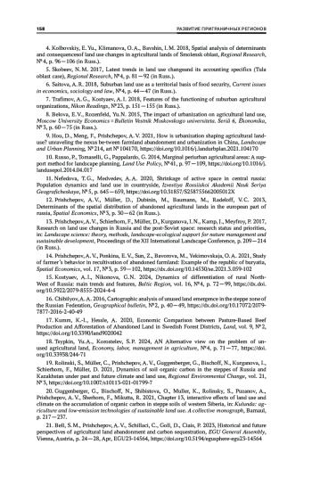 Прищепов, А. В., Шиерхорн, Ф., Мюллер, Д., Курганова, И. Н., Камп, Й., Мейфруа, П. 2017, Исследование изменений землепользования в России и на постсоветском пространстве: состояние исследований и приоритеты, в: Ландшафтоведение: теория, методы, ландшафтно-экологическое обеспечение природопользования и устойчивого развития, Материалы XII Международной ландшафтной конференции, с. 209—214, EDN: ZUYSQL