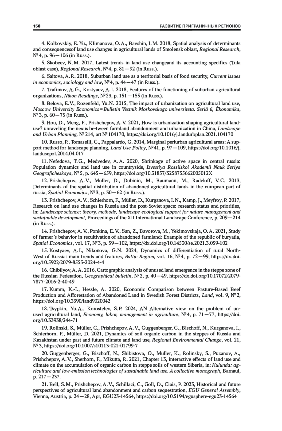 Прищепов, А. В., Мюллер, Д., Дубинин, М. Ю., Бауманн, М., Раделофф, В. К. 2013, Детерминанты пространственного распределения заброшенных сельскохозяйственных земель в Европейской части России, Пространственная экономика, № 3, с. 30—62, EDN: SBPPIR