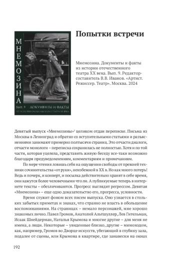 1. Мнемозина. Документы и факты из истории отечественного театра XX века. Вып. 9 / Ред.-сост. В.В. Иванов. - М.: Артист. Режиссер. Театр, 2024. - 432 с.