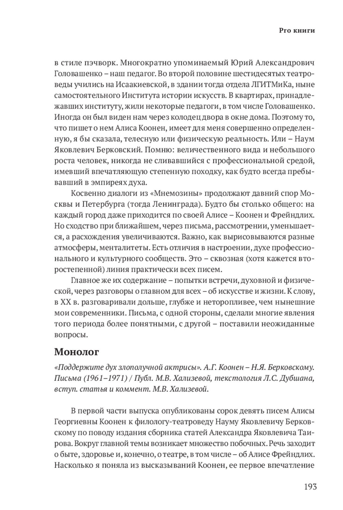 Статья посвящена девятому выпуску «Мнемозины» (Мнемозина. Документы и факты из истории отечественного театра XX века. Вып. 9. Редактор-составитель В. В. Иванов. «Артист. Режиссер. Театр». Москва. 2024). Однако это не просто рецензия на книгу в привычном понимании, а скорее диалог автора с ее героями - Алисой Коонен, Наумом Берковским, Натальей Крымовой, Борисом Зингерманом и др., а также с самим временем - с XX в. и театром, который он подарил. Статья - своего рода мемуары, вызванные к жизни опубликованными в книге письмами, а кроме того - анализ сказанного в них в контексте отечественной культуры и жизни как таковой. Внимание уделяется и вопросу о значении публикации документов.