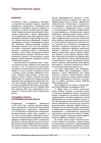 Актуальность нашего исследования обусловлена недостаточным уровнем владения студентами медицинских университетов интеллектуальными умениями на иностранных языках по профилю их подготовки, что является препятствием для эффективной профессиональной межкультурной коммуникации специалистов в области здравоохранения.