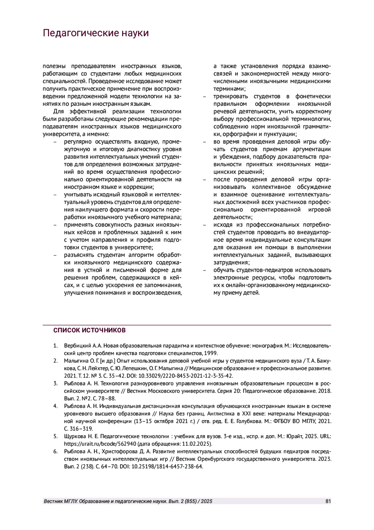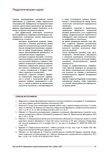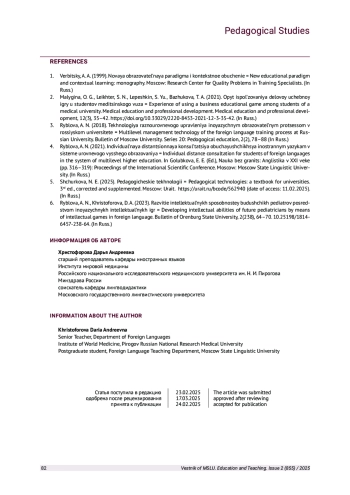 6. Рыблова А. Н., Христофорова Д. А. Развитие интеллектуальных способностей будущих педиатров посредством иноязычных интеллектуальных игр // Вестник Оренбургского государственного университета. 2023. Вып. 2 (238). С. 64-70. DOI: 10.25198/1814-6457-238-64 EDN: ILFUIG