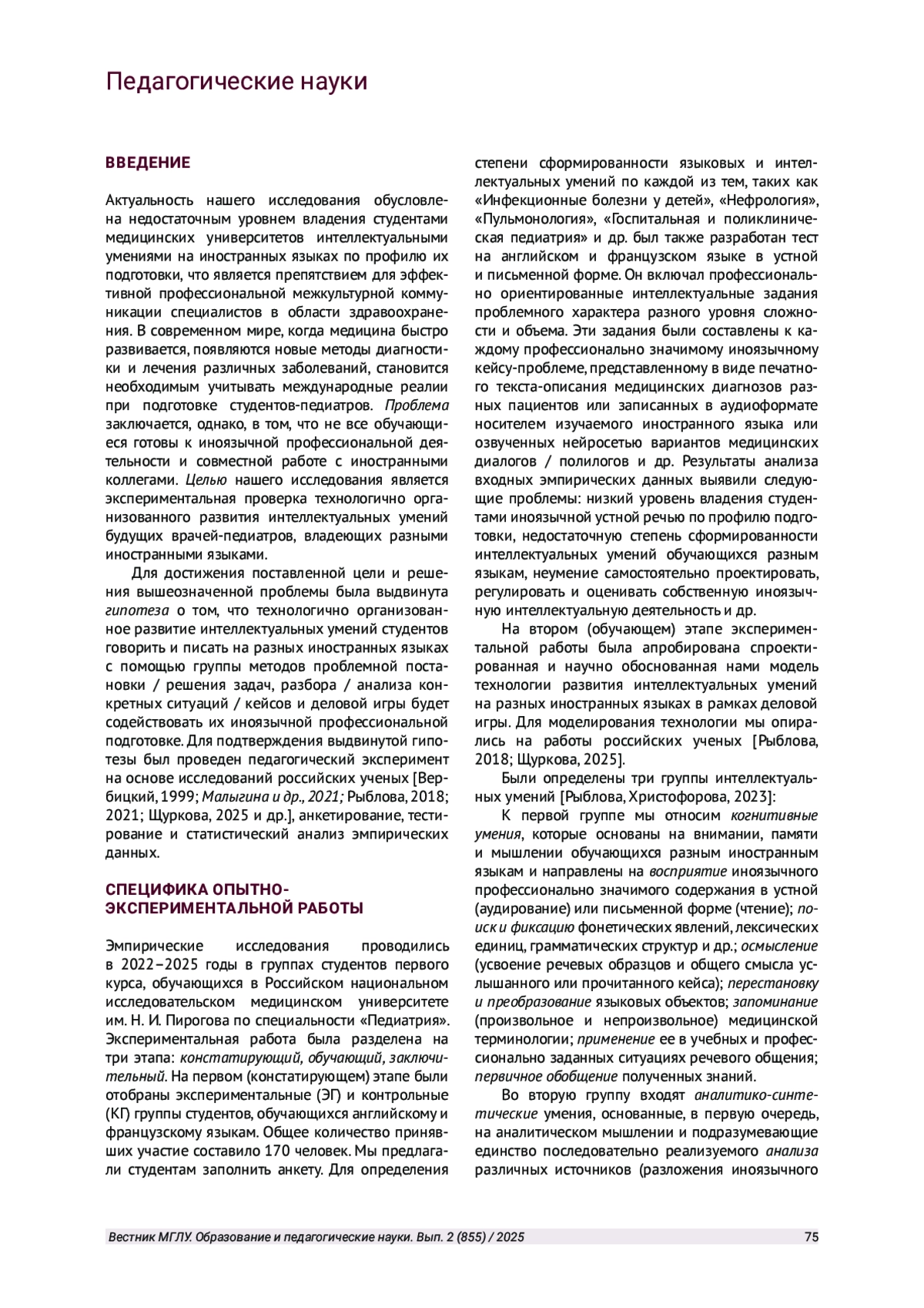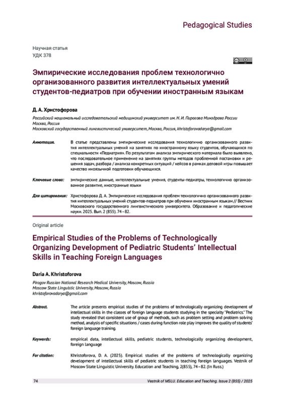 В статье представлены эмпирические исследования технологично организованного развития интеллектуальных умений на занятиях по иностранному языку студентов, обучающихся по специальности «Педиатрия». По результатам анализа эмпирического материала было выявлено, что последовательное применение на занятиях группы методов проблемной постановки и решения задач, разбора / анализа конкретных ситуаций / кейсов в рамках деловой игры повышает качество иноязычной подготовки обучающихся.