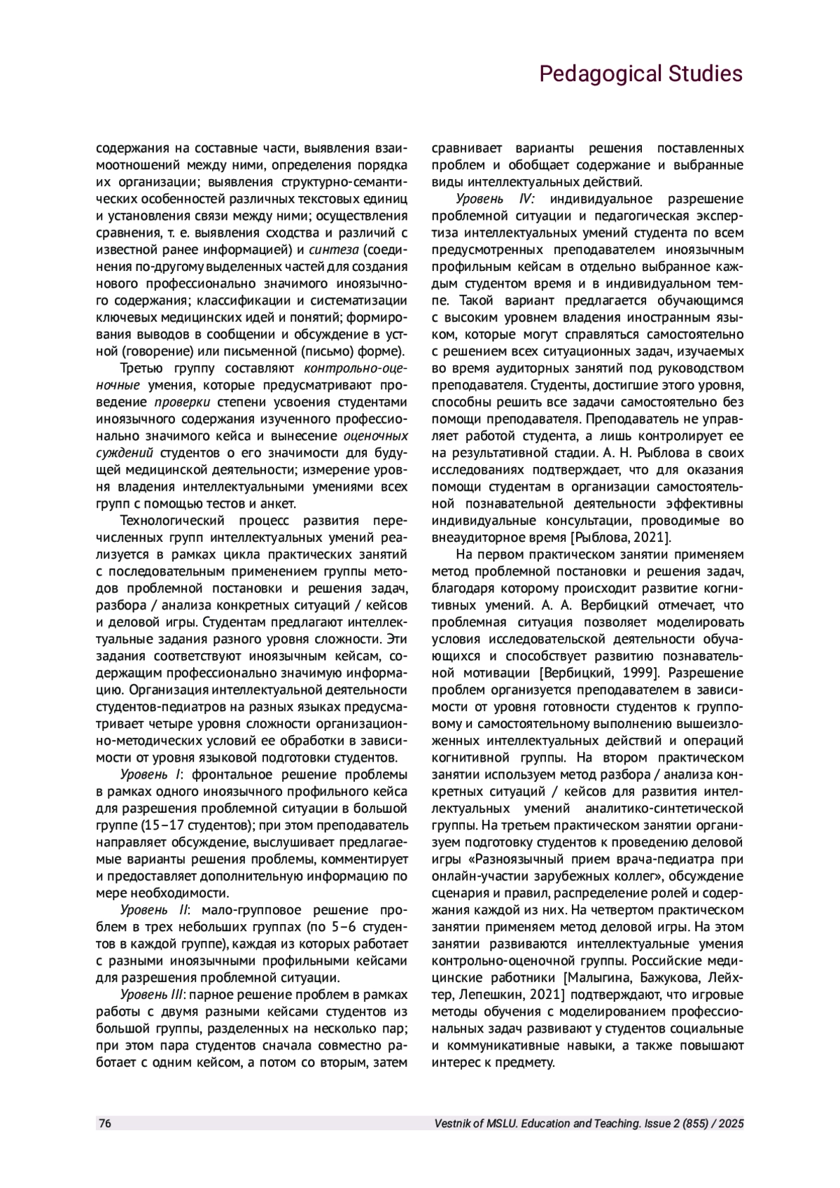 3. Рыблова А. Н. Технология разноуровневого управления иноязычным образовательным процессом в российском университете // Вестник Московского университета. Серия 20: Педагогическое образование. 2018. Вып. 2. №2. С. 78-88. EDN: YWQSWV