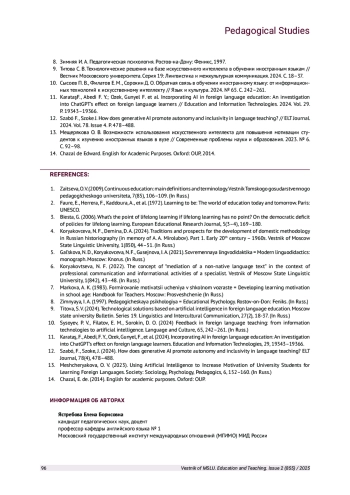 12. Szabó F., Szoke J. How does generative AI promote autonomy and inclusivity in language teaching? // ELT Journal. 2024. Vol. 78. Issue 4. P. 478-488. EDN: UAROOD