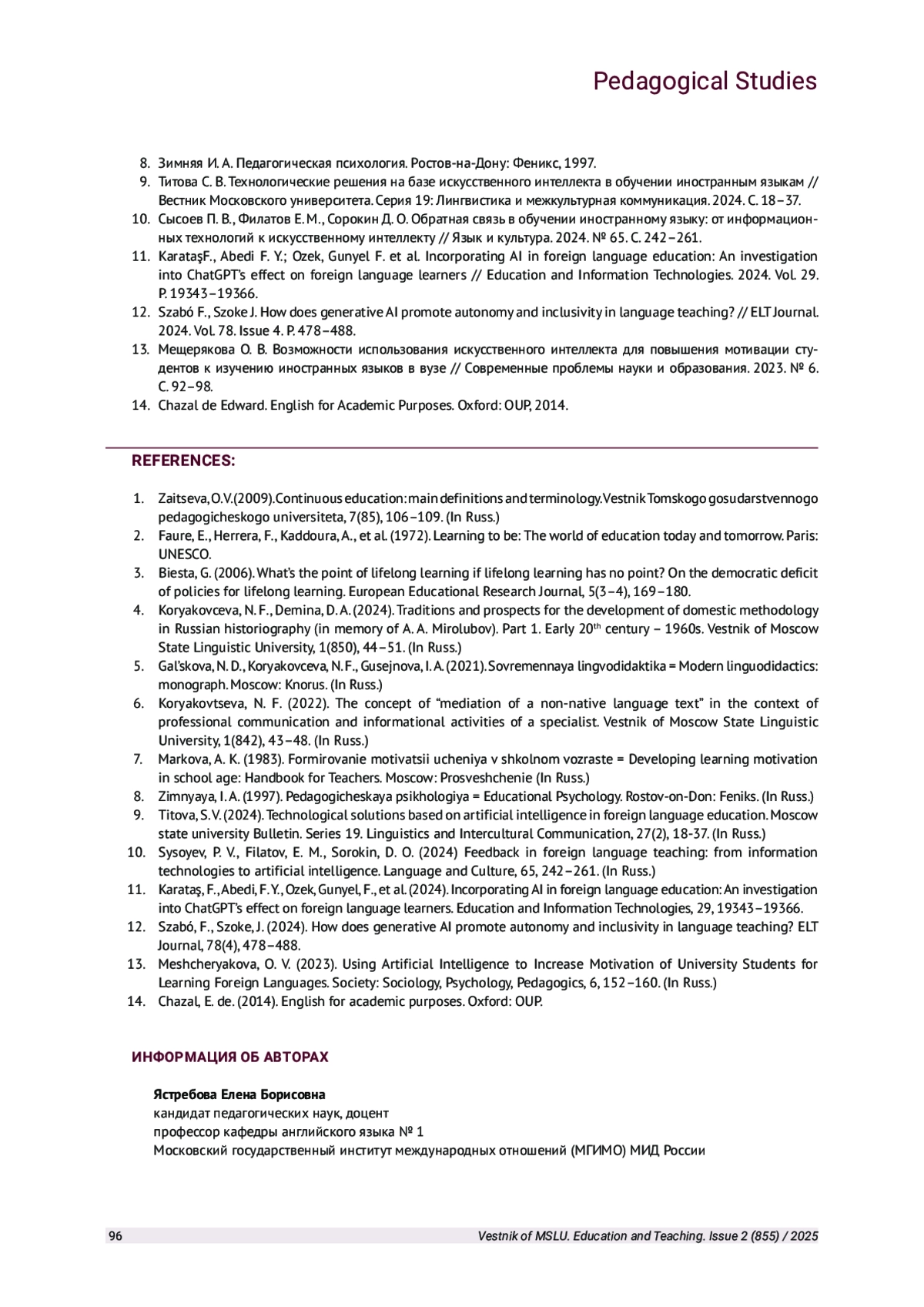 13. Мещерякова О. В. Возможности использования искусственного интеллекта для повышения мотивации студентов к изучению иностранных языков в вузе // Современные проблемы науки и образования. 2023. № 6. С. 92-98.