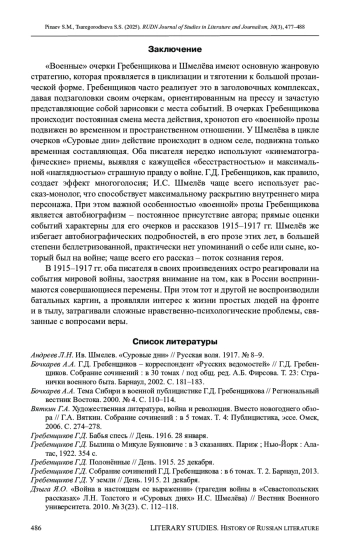 Рассматриваются основные жаровые модели «военной» прозы Г. Д. Гребенщикова и И. С. Шмелёва. Актуальность работы определяется как избранным материалом - малоизученными и впервые введенными в научный оборот очерками и рассказами о Первой мировой войне, так и аспектом исследования - выявлением специфики авторских позиций и жанровых стратегий писателей. Задача - сравнить военные корреспонденции Гребенщикова - участника Первой мировой войны, очерки которого как бы взгляд на события «изнутри», и Шмелёва, который провел годы войны в тылу и высказывал точку зрения «извне». Различные жизненные и творческие позиции авторов способствуют воссозданию объективной картины Первой мировой войны, позволяют выявить основные жанровые модели у Гребенщикова (заметки, зарисовки, путевые очерки с преобладанием автобиографических мотивов), а также тенденцию к беллетризации «военной» прозы у Шмелёва. При этом у обоих прозаиков просматриваются схожие жанровые стратегии, связанные с эволюцией, - от очерков и рассказов к роману.