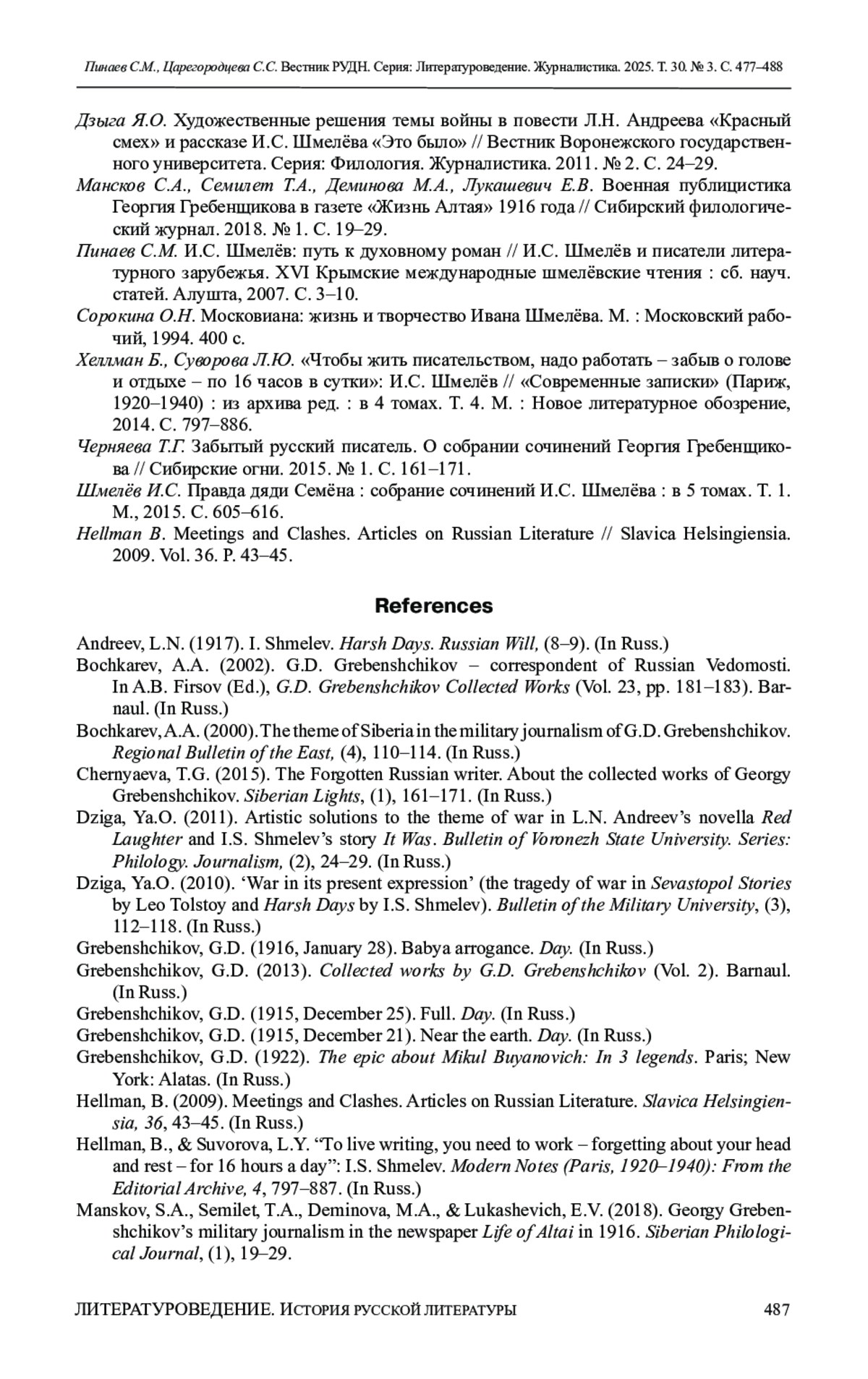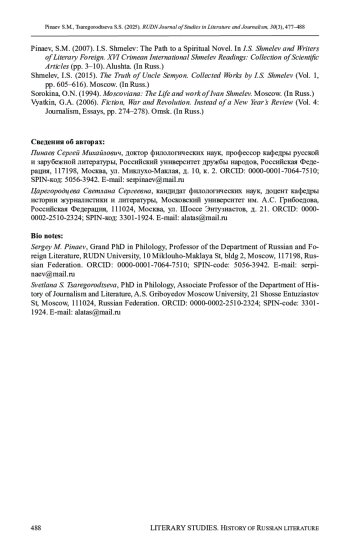 15. Хеллман Б., Суворова Л.Ю. “Чтобы жить писательством, надо работать - забыв о голове и отдыхе - по 16 часов в сутки”: И.С. Шмелёв // “Современные записки” (Париж, 1920-1940): из архива ред.: в 4 томах. Т. 4. М.: Новое литературное обозрение, 2014. С. 797-886. EDN: VMUCFJ