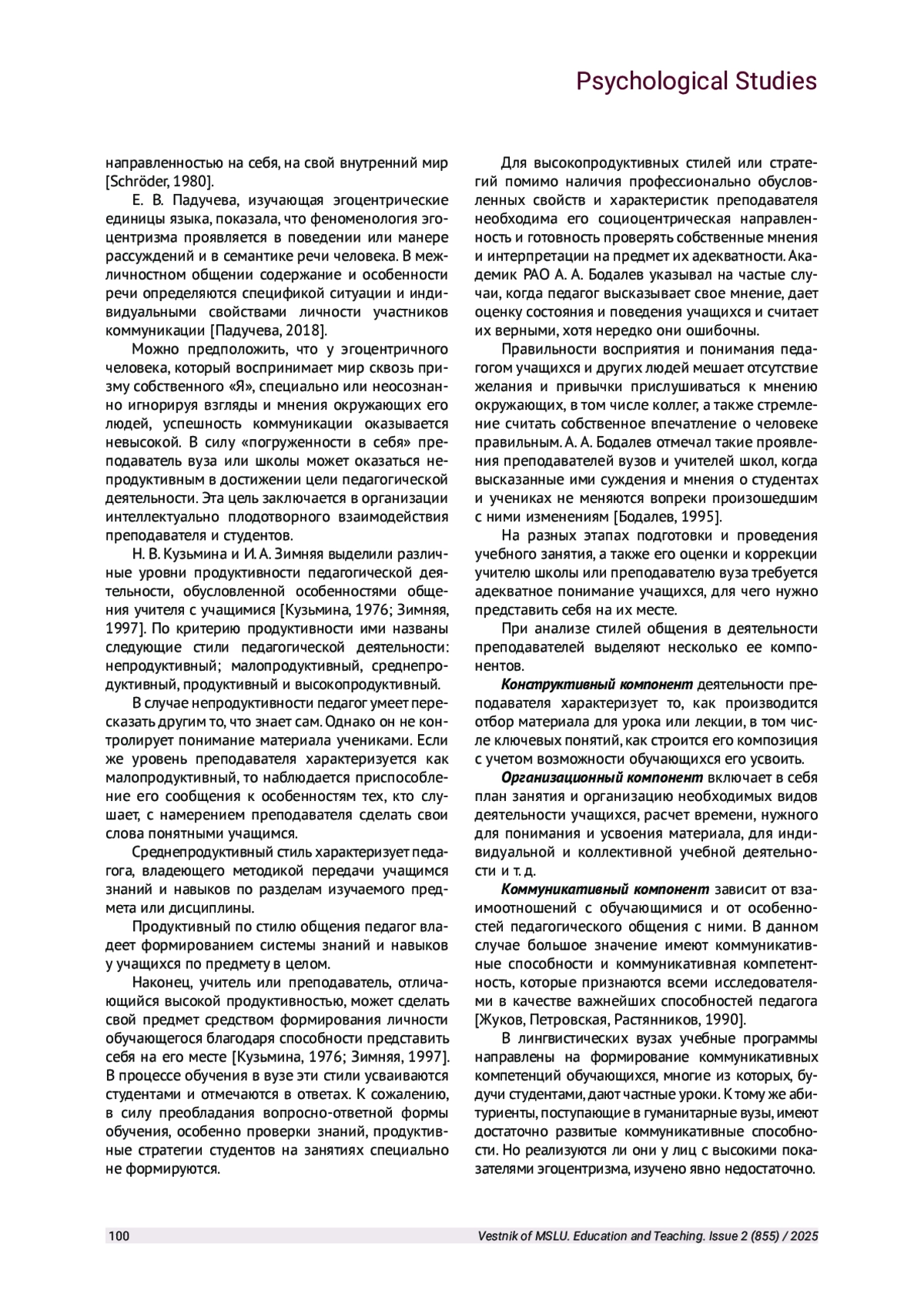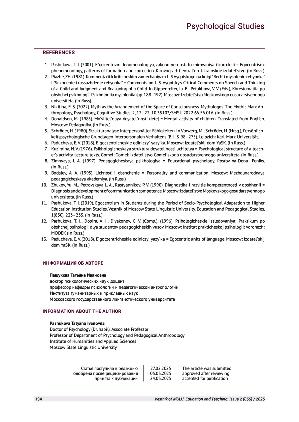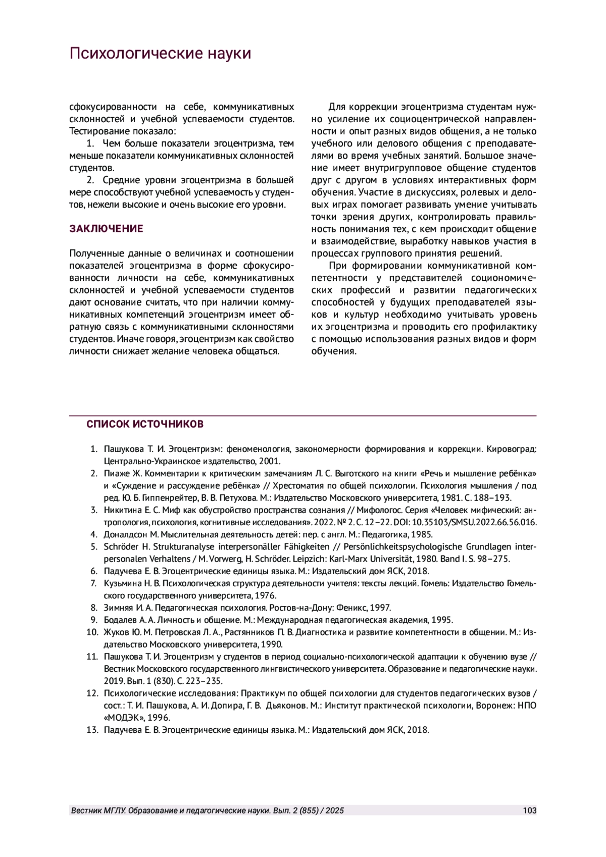 11. Пашукова Т. И. Эгоцентризм у студентов в период социально-психологической адаптации к обучению вузе // Вестник Московского государственного лингвистического университета. Образование и педагогические науки. 2019. Вып. 1 (830). С. 223-235. EDN: YNWJUI