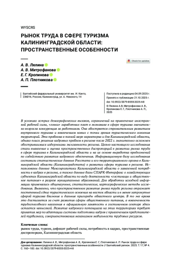 В условиях острых демографических вызовов, ограничений на привлечение иностранной рабочей силы, «гонки» заработных плат в экономике в сфере туризма значительно возросла конкуренция за работников. Она обостряется стремительным развитием внутреннего туризма и вовлечением новых с точки зрения туристического освоения территорий. Эта проблема в полной мере характерна и для Калининградской области, однако поиск решения кадровых проблем в регионе после 2022 г. значительно осложнен обострившимися издержками эксклавности региона. Целью настоящего исследования стали выявление и оценка пространственных диспропорций в развитии рынка труда в сфере туризма в Калининградской области и на их основе выработка предложений по содействию развития кадрового обеспечения. Информационную базу исследования составили статистические данные Росстата и его территориального органа в Калининградской области (Калининградстата) о развитии сферы туризма в регионе. Использованы данные Минсоцполитики Калининградской области о заявленной потребности в кадрах в регионе, а также данные базы СПАРК-Интерфакс о хозяйствующих субъектах Калининградской области по виду деятельности «гостиницы и общественное питание» в разрезе муниципальных образований. Для обработки исходной информации применялись общенаучные, статистические, картографические методы исследования. Выявлено, что пространственное развитие рынка труда региона отражает постепенный сдвиг туристического освоения на восток области и в менее затронутые сферой туризма ближние и дальние пригороды областного центра. В то же время это достигается за счет развития сферы общественного питания, а вовлеченность трудоспособного населения в официальную занятость в гостиничном секторе здесь остается невысокой. Развитие кадрового потенциала на этих территориях требует принятия мер по адаптации системы подготовки кадров с привлечением представителей турбизнеса, совершенствования механизмов мобильности трудовых ресурсов.