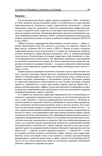 В Калининградской области сфера туризма, наиболее пострадавшая в период пандемии [26], в постпандемийный период испытывает «бум» на фоне роста внутреннего спроса [14; 27]. Регион постоянно включается в рейтинги туристической привлекательности, а его туристический потенциал далек от исчерпания [28].