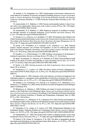 Анохин, А. Ю., Корнеевец, В. С., Костюк, А. П., Кропинова, Е. Г., Митрофанова, А. В., Семенова, Л. В., Хильшер, В. А. 2022, Приоритетные направления развития туризма в Калининградской области, Калининград, 85 с., EDN: WMWJAV
