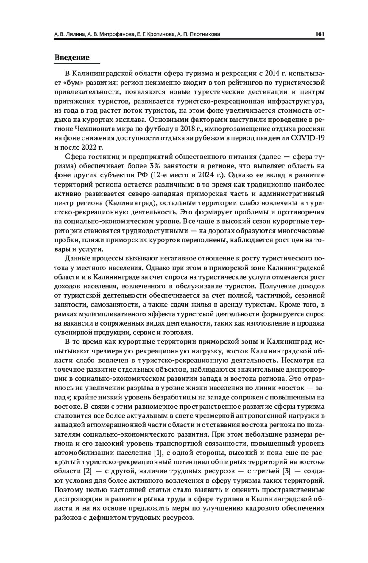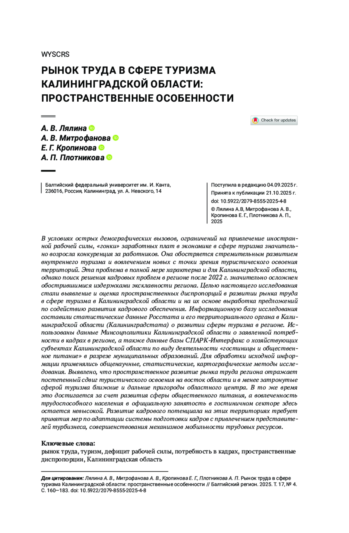 Плотникова, А. П. 2025, Пространственные особенности размещения трудового потенциала Калининградской области, Географический вестник, № 2 (73), с. 17—30, EDN: AFMONY, https://doi.org/10.17072/2079-7877-2025-2-17-30