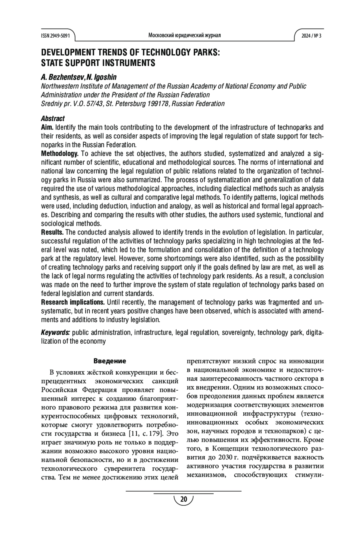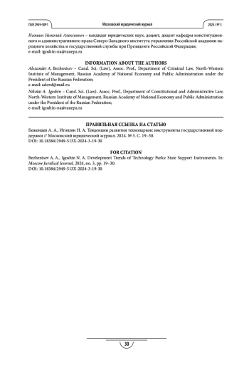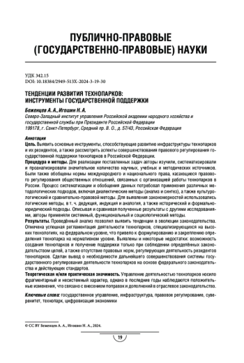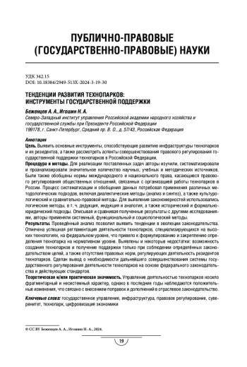 Процедура и методы. Для реализации поставленных задач авторы изучили, систематизировали и проанализировали значительное количество научных, учебных и методических источников. Были также обобщены нормы международного и национального права, касающиеся правового регулирования общественных отношений, связанных с организацией работы технопарков в России. Процесс систематизации и обобщения данных потребовал применения различных методологических подходов, включая диалектические методы (анализ и синтез), а также культурологический и сравнительно-правовой методы. Для выявления закономерностей использовались логические методы, в т. ч. дедукция, индукция и аналогия, а также исторический и формальноюридический подходы. Описывая и сравнивая полученные результаты с другими исследованиями, авторы применяли системный, функциональный и социологический методы.