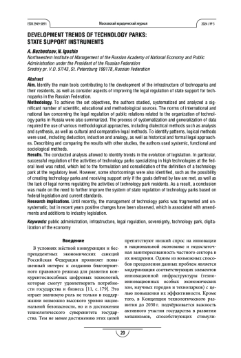 Специалисты отмечают, что одним из способов поддержания высоких темпов развития технопарков, в т. ч. тех, которые специализируются на высоких технологиях, является совершенствование правового регулирования [1; 3; 4; 6].