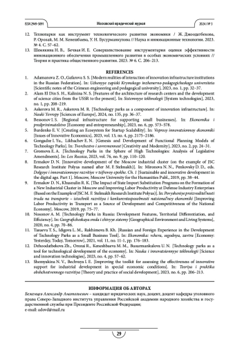 1. Адаманова З. О., Гафарова С. С. Современные реалии взаимодействия институтов инновационной инфраструктуры в Российской Федерации // Ученые записки Крымского инженерно-педагогического университета. 2023. № 1. С. 32-37.